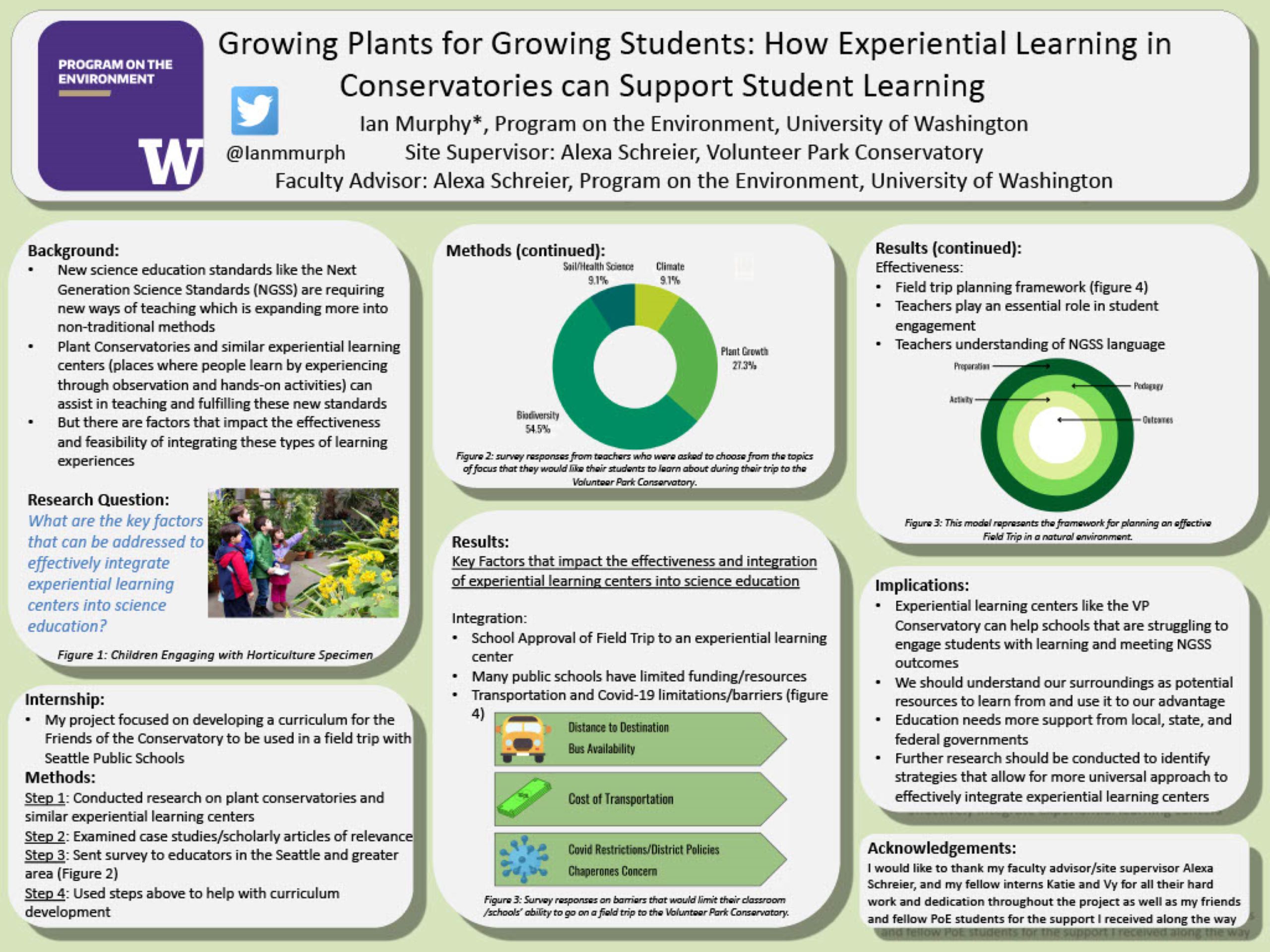 With the implementation of new science education standards such as the Next Generation Science Standards (NGSS), it is challenging for schools and teachers to effectively teach in a way that fulfills these new standards. Many schools are also struggling to engage students with learning which is inhibiting their intellectual growth. By bringing students to experiential learning centers, this helps enhance students’ learning and improves academic performance while fulfilling new science education standards. The aim of this study was to identify factors that play into school board approval for proposed field trips to experiential learning centers, and apply what was learned to a curriculum for the Friends of the Conservatory (FOC) at the Volunteer Park Conservatory. To accomplish this goal, I conducted an analysis of case studies pertaining to experiential learning in nature/outdoor settings and an analysis of scholarly articles that focus on teaching pedagogy, education reform and stakeholders involved, and NGSS and its implications. In constructing the curriculum, my group and I examined other learning centers and education programs they implemented and conducted a survey for teachers in and around the Seattle area. My findings supported the reasoning to utilize experiential learning centers as learning tools because of the positive learning outcomes of students as a result, and revealed the obstacles to education reform, especially in regards to NGSS and how this utilization can help in overcoming those obstacles. These results are important because it supports the fact that experiential learning not only helps schools teach and engage students with new science education standards like NGSS, but also shows considerations experiential learning centers themselves can make when developing a curriculum.