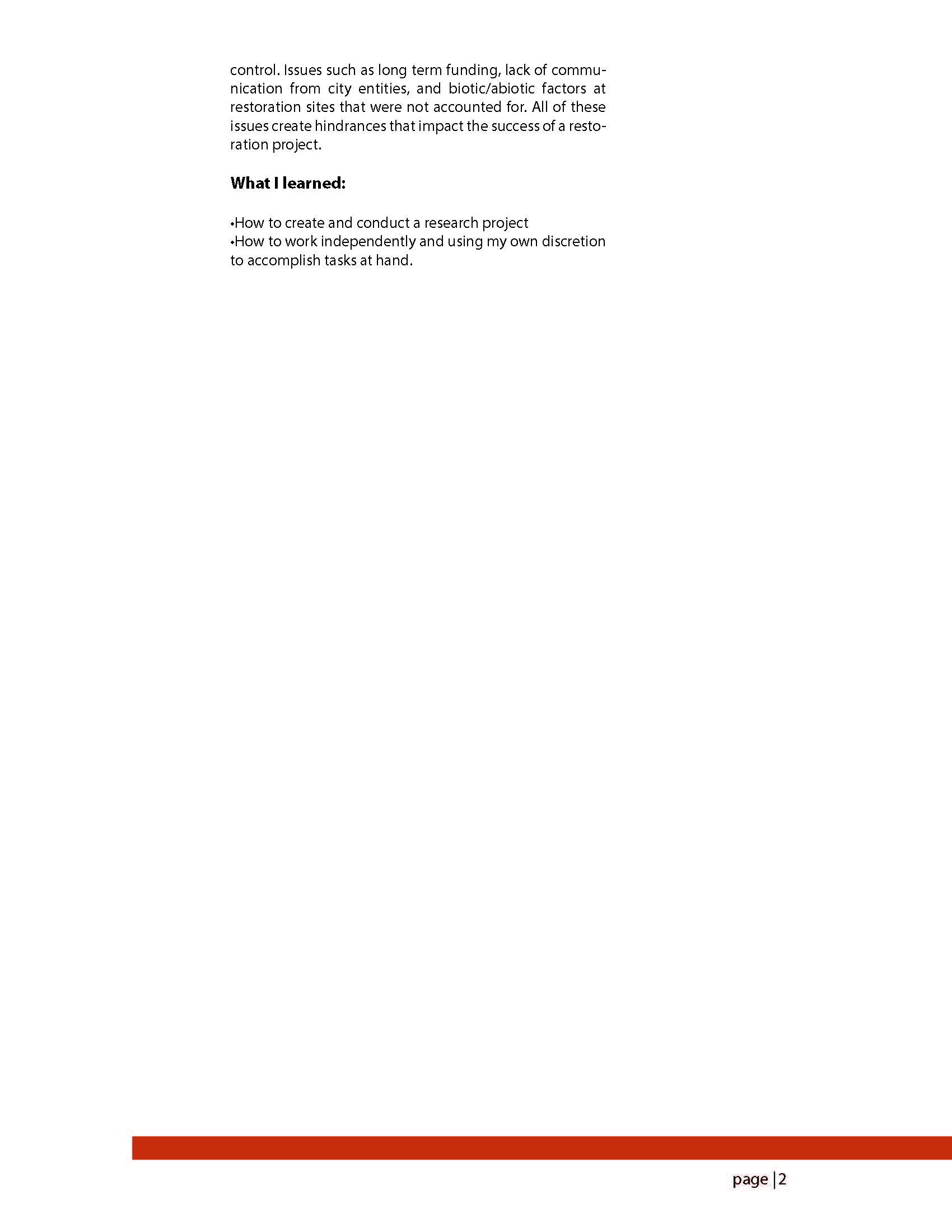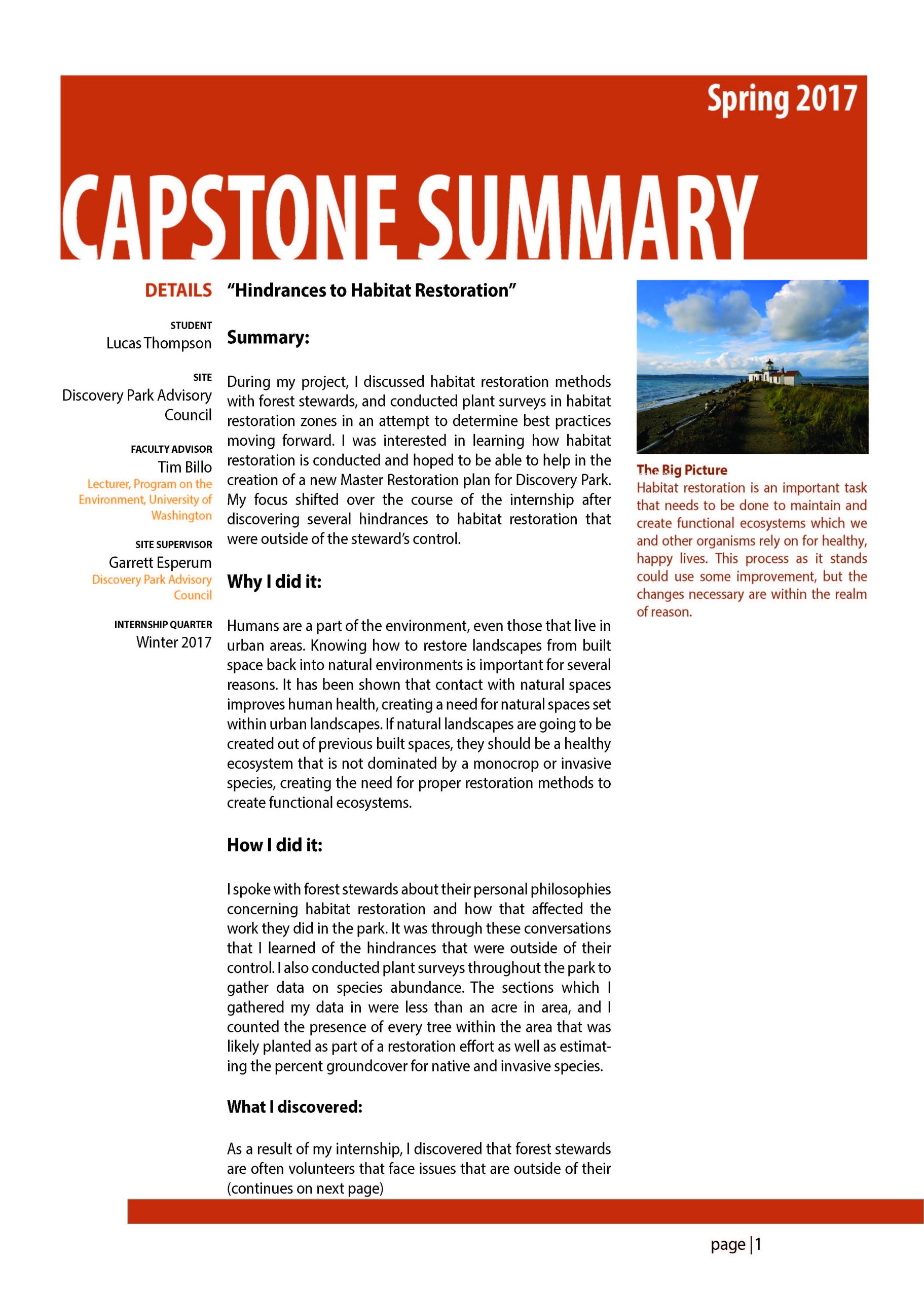 During my project, I discussed habitat restoration methods with forest stewards, and conducted plant surveys in habitat restoration zones in an attempt to determine best practices moving forward. I was interested in learning how habitat restoration is conducted and hoped to be able to help in the creation of a new Master Restoration plan for Discovery Park. My focus shifted over the course of the internship after discovering several hindrances to habitat restoration that were outside of the steward’s control.