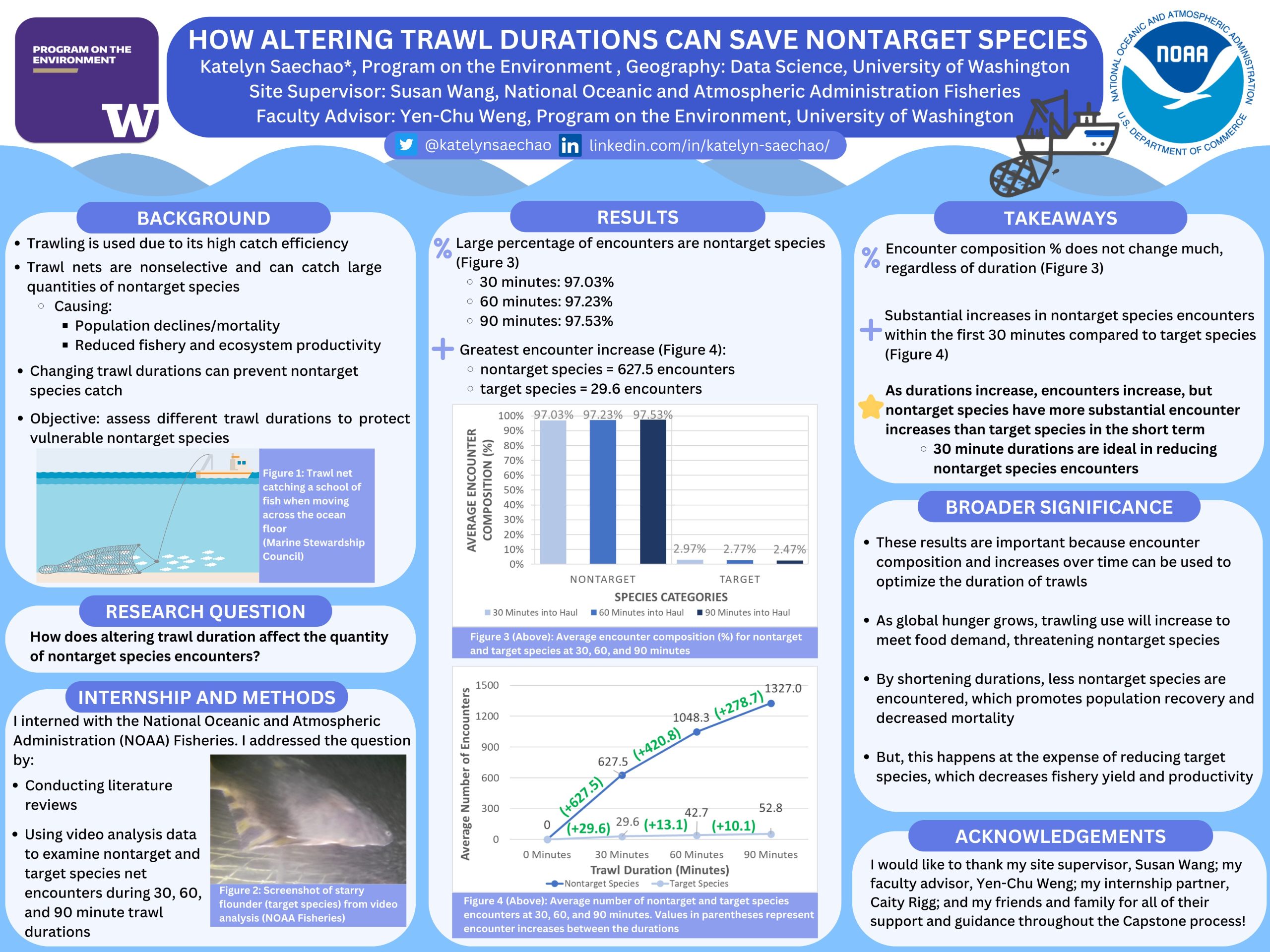 The growing population and subsequent rise in food demand have resulted in a heavier reliance on fisheries and trawling. Trawling in fisheries has grown because it is efficient at catching fish by simply dragging a large net across the sea floor. However, trawl nets are nonselective, meaning unintended species can also be caught. This increases the risk of overharvesting and death for unintended species while reducing the chances for target species to be caught due to bycatch quotas. The purpose of this study was to determine ideal trawl durations that decrease nontarget species catch. To address this, I interned with the National Oceanic and Atmospheric Administration (NOAA) Fisheries and analyzed video footage from trawl net cameras to identify how species interact with the net. My observations were recorded in a datasheet where I noted information about the species, number of species encountered, and behaviors exhibited. The findings suggest that as trawl durations increase, nontarget species encounters increase substantially, whereas target species encounters experience a slight increase in comparison. Additionally, the findings suggest that short 30-minute durations could reduce nontarget species bycatch, but less target species might be caught as well. By shortening trawl durations, fewer nontarget and target species are caught, which supports the protection of nontarget species. But this may prevent target species catch from meeting food demand. Therefore, the use of shorter trawl durations in combination with other mitigation strategies must be considered and assessed to achieve the goals of minimizing nontarget species and maximizing target species catch.