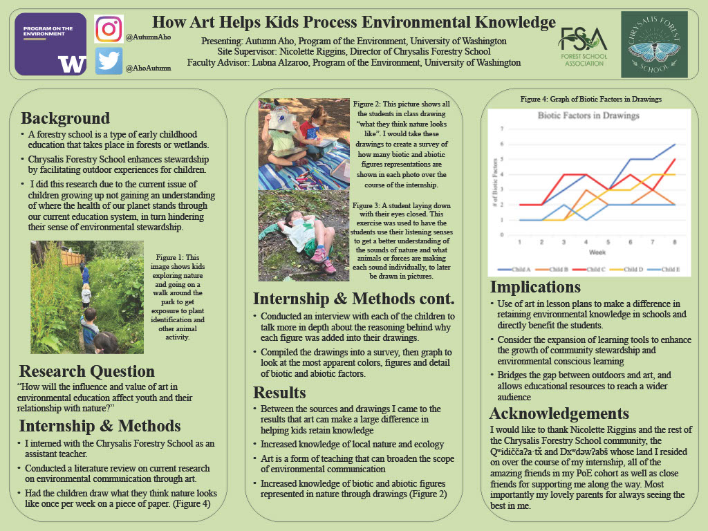 My research project was focused on environmental education, a way to connect to future generations and create a framework for teaching methods. New practices are still being established within community efforts and educational data to support effective and meaningful learning strategies. This research seeks to understand how forestry schools as educational spaces can help students understand the environment more deeply through the use of data analysis. In order to answer this question, I made an annotated bibliography for 10 sources related to environmental education, forestry school, and using art as a teaching method. My internship was working with the Chrysalis Forestry School as an assistant teacher. I would collect data regarding if art can make a difference in supporting children to digest environmental knowledge. I did this research due to the current issue of children growing up not gaining an understanding of where the health of our planet stands through our current education system, in turn hindering their sense of environmental stewardship. My study had the forestry students draw what they think nature looks like throughout the internship. I took those drawings and analyzed the biotic and abiotic properties into a survey. In the survey over the internship I saw an increase in details and biotic figures, showcasing the importance of living figures to create a healthy biodiverse environment. Between the sources and drawings I came to the results showing that art can make a large difference in helping kids retain knowledge. Art is a form of teaching that can broaden the scope of environmental communication that I found through this research of teaching environmental ethics to children. Along with all sustainable resource management through a mixed methods approach of art along with an analytical method of surveys. This together gave me the most effective summary of the research that looked into the scale of environmental consciousness the students had when drawing their art and looking at the patterns of changes throughout the course length. These findings of this research are primarily meant for Chrysalis Forestry School, an outdoor school that can use the implications of art to make a difference in retaining environmental knowledge in schools and directly benefit the students.