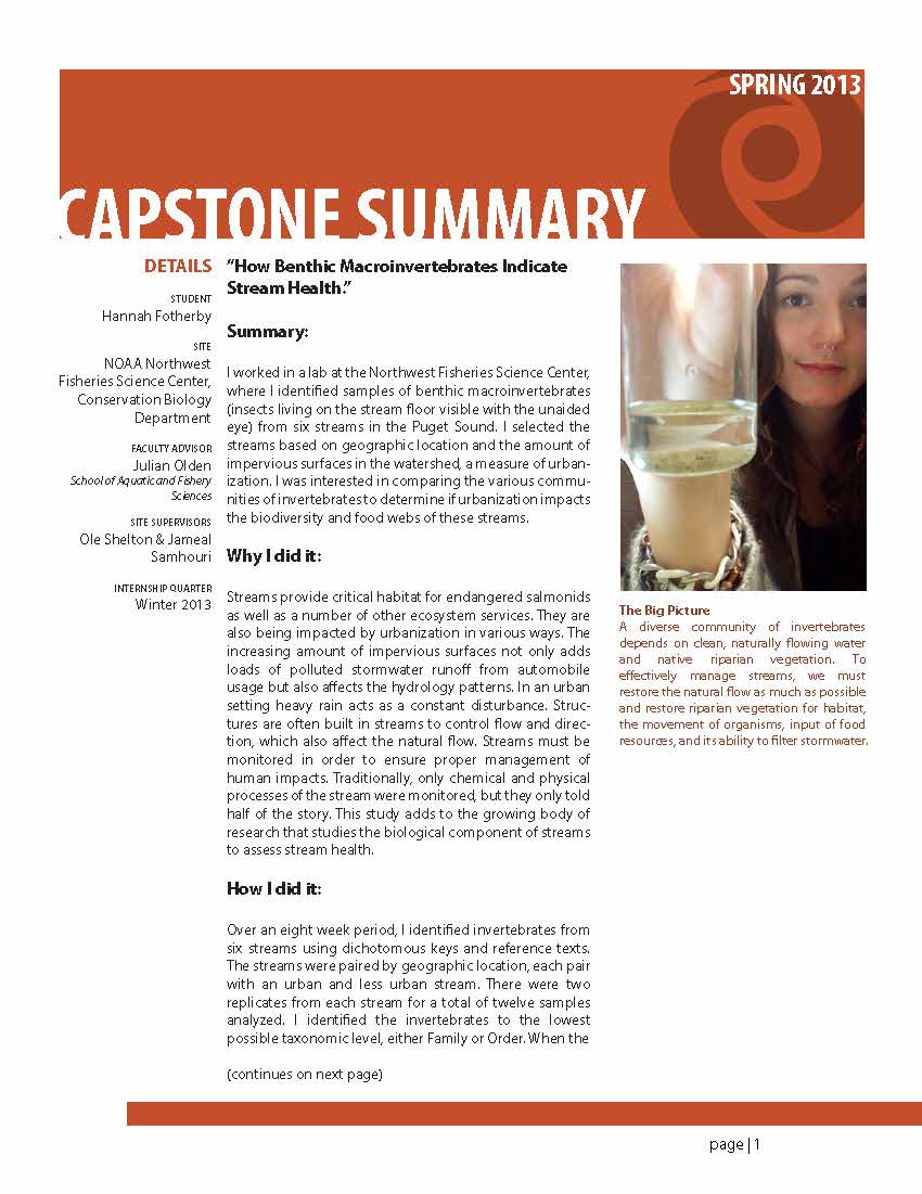 I worked in a lab at the Northwest Fisheries Science Center, where I identified samples of benthic macroinvertebrates (insects living on the stream floor visible with the unaided eye) from six streams in the Puget Sound. I selected the streams based on geographic location and the amount of impervious surfaces in the watershed, a measure of urbanization. I was interested in comparing the various communities of invertebrates to determine if urbanization impacts the biodiversity and food webs of these streams.