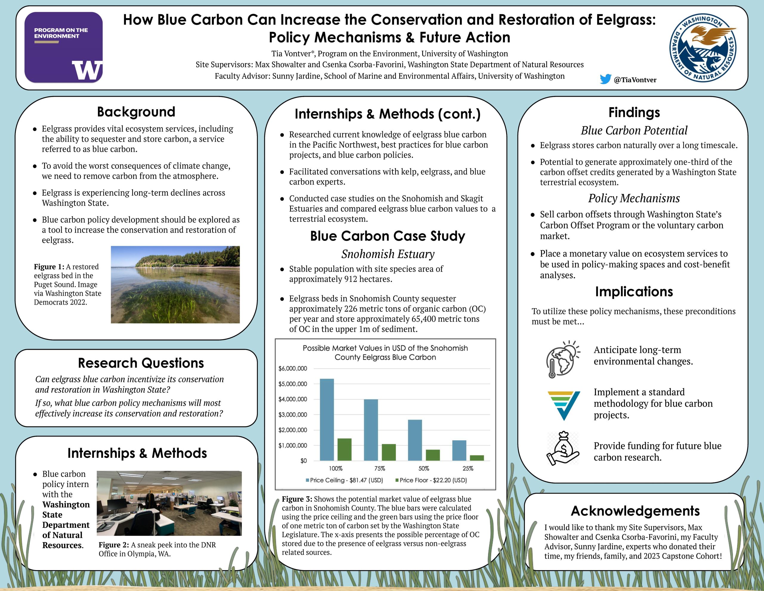 As the global environment deteriorates, we have begun to realize the value of ecosystem services. Kelp and Eelgrass are important nearshore ecosystems whose ability to sequester and store carbon, or blue carbon potential, can incentivize their protection to maximize the ecosystem services they provide. The aim of this study was to understand what actions and policy mechanisms could be implemented to maximize the protection of kelp and eelgrass based on their blue carbon potential. During my internship, I worked with the Washington State Department of Natural Resources to compile current information on kelp and eelgrass blue carbon in the Pacific Northwest. For my research, I synthesized scholarly publications, conducted conversations with experts, and developed blue carbon case studies on the Skagit and Snohomish Estuaries. I found that kelp’s blue carbon potential is highest under aquaculture with active human intervention. Yet, eelgrass ecosystems have blue carbon potential that can be increased by conservation and restoration alone. Therefore, policy solutions include the monetary valuation of the blue carbon potential of eelgrass ecosystems to be used in cost-benefit analyses or as carbon offset credits in the carbon market to develop revenue. With increased conservation and restoration of eelgrass ecosystems, not only will climate change be mitigated, but many ecosystem co-benefits will be provided, such as climate adaptation, vital habitats for culturally and commercially important species, erosion prevention, and more. If revenue is generated through the carbon market, the Department of Natural Resources can reinvest in Washington State communities or further conservation and restoration.