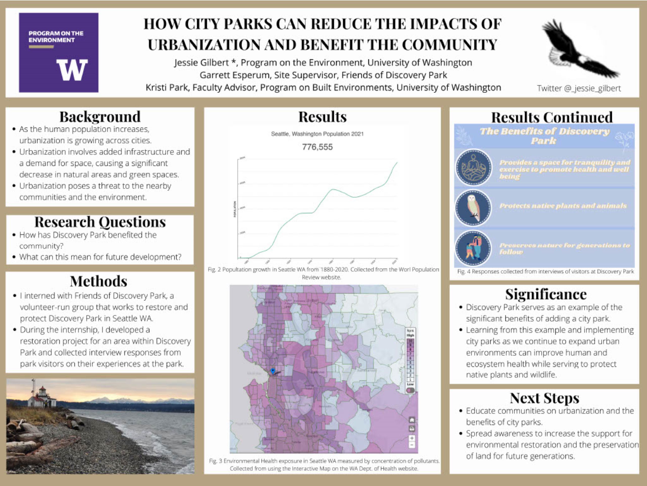 As the human population increases, urbanization is growing across cities and with it comes added infrastructure and a demand for space, causing a significant decrease in natural areas and green spaces. Incorporating more city parks could reduce the harmful environmental effects of urbanization and improve human well being while promoting sustainable actions. This study focused on the negative environmental effects of urbanization, how we can avoid them, and the benefits we would gain from doing so. I interned with Friends of Discovery Park, a volunteer-run group that works to restore and protect Discovery Park. During the internship I performed extensive research in order to analyze the role city parks play in an urban environment. I also developed a survey to measure connectedness to nature in people at Discovery Park vs people in my hometown without a major city park nearby. My results showed that people who regularly visit city parks and have access to city parks, show a higher connectedness to nature and a better state of well-being. The people who didn’t visit city parks often showed less desire to take action in protecting the environment. Increasing the amount of city parks can allow for communities to destress from the city life and build their connection with nature. This could also lead to an increase in support of environmental restoration activities to conserve and protect wildlife in city parks in this generation and the ones to follow.