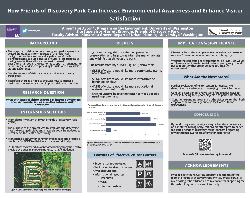 The purpose of a visitor center is to inform people of the historic background and environmental significance of the land being dedicated to public use. Public parks of the United States are applauded for providing people in a city with a much-needed reprieve from what otherwise can be a “concrete jungle.” My internship with Friends of Discovery Park (“FODP”) aimed to evaluate the existing state of the Discovery Park Visitor Center. In doing so, I updated the resources and display materials to better serve the Seattle community. I framed my research by asking the question: can public space be utilized to increase awareness of environmental issues and simultaneously enhance visitor satisfaction? To answer this question, I completed an annotated bibliography, conducted a community survey, a literature review, created a brochure for FODP, and reviewed the visitor center firsthand. The results from my survey showed that 65% of people would like more community events and activities, 58% want more interactive displays, and 44% desired more educational materials and information available at the visitor center. Through utilizing the results of my research into the visitor center, FODP can increase awareness of environmental issues as well as enhance visitor satisfaction.