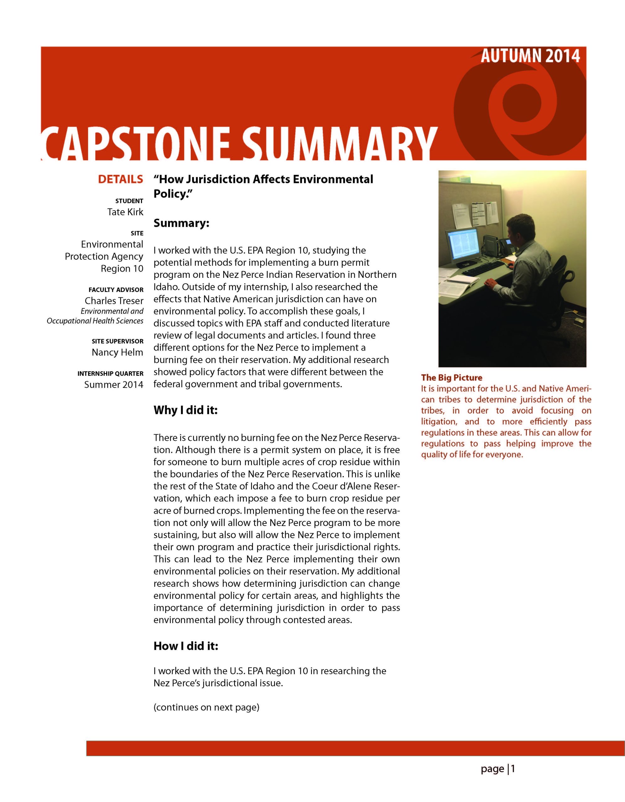 I worked with the U.S. EPA Region 10, studying the potential methods for implementing a burn permit program on the Nez Perce Indian Reservation in Northern Idaho. Outside of my internship, I also researched the effects that Native American jurisdiction can have on environmental policy. To accomplish these goals, I discussed topics with EPA staff and conducted literature review of legal documents and articles. I found three different options for the Nez Perce to implement a burning fee on their reservation. My additional research showed policy factors that were different between the federal government and tribal governments.