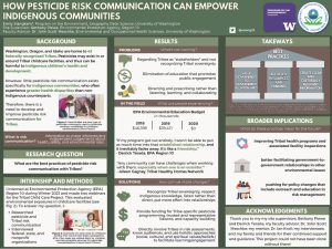 Pesticides are often found in the air we breathe, the water we drink, and the soil children play in; thus, they are potentially present in Indigenous children’s environments. They can have harmful impacts to children’s health and development, ranging from conditions like vomiting and nausea to long-term effects such as cancer and neurological toxicity. Although risk communication plays a critical role in ensuring public health, very little pesticide risk communication exists specifically for Tribes, who often experience greater health disparities than their non-Indigenous counterparts. The purpose of this study was to determine the best practices of risk communication for pesticide use with Tribes to promote behavioral change. To accomplish this task, I performed extensive research and literature reviews that helped to develop two audience tailored webinars for the Environmental Protection Agency (EPA) Region 10, build pesticide background knowledge, identify environmental risk communication methodologies, and learn more about Indigenous communities’ experiences with risk assessments. This information was compared to interview responses surrounding working with Tribes and pesticide risk communication, sourced from 30-minute interviews with personnel working in federal, state, and nonprofit organizations. My findings demonstrate that best practices include recognizing the role of federal agencies in appreciating and maintaining cooperative government-to-government relationships with Tribes, allocation of resources for Tribal pesticide programs and staff, and developing clear and culturally specific communication for Tribes. Through these practices, we can improve Tribal health, better facilitate government-to-government relationships in environmental issues and push for policy changes that include outreach and education in risk management.