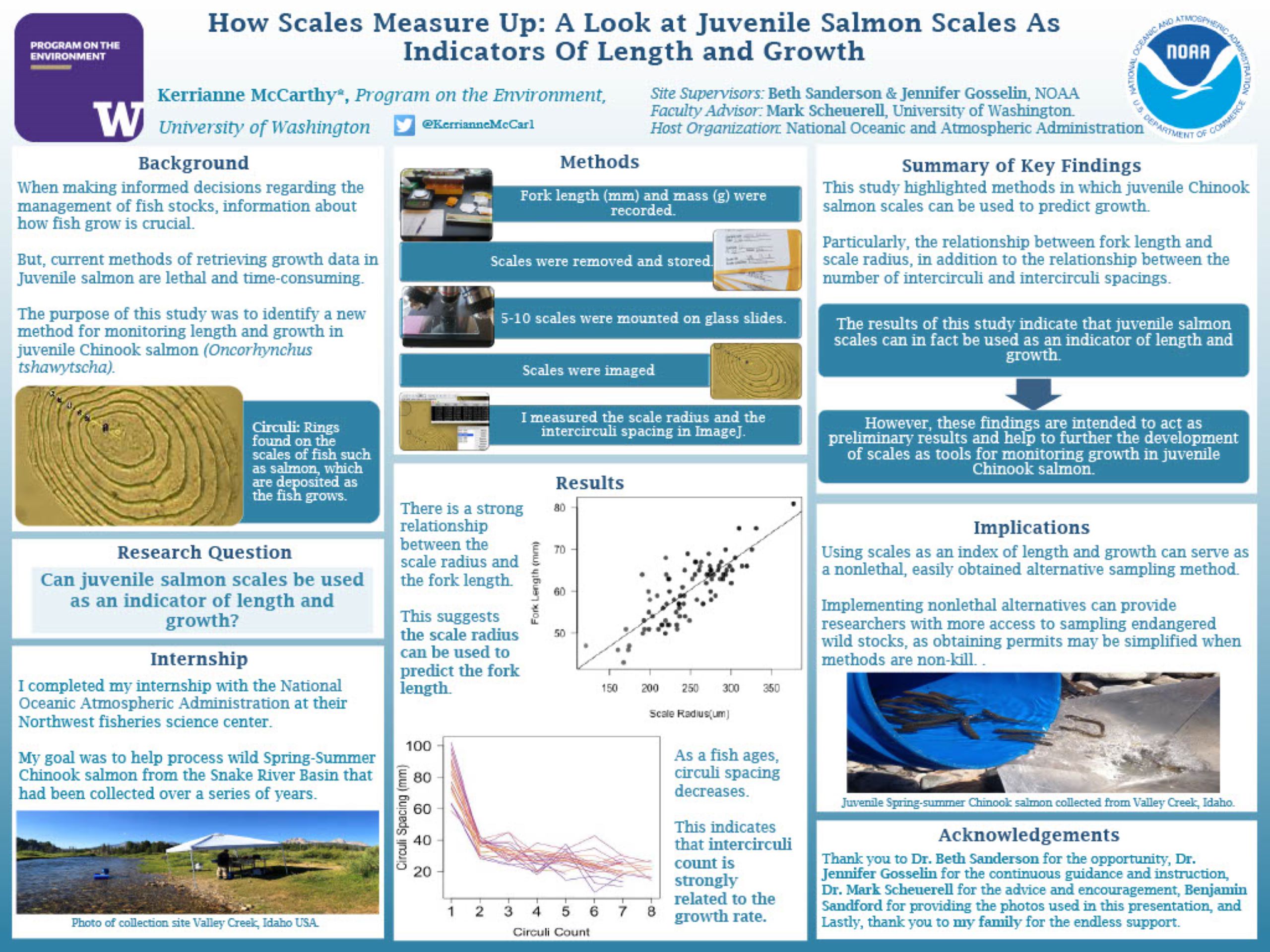 When making informed decisions regarding the management of fish stocks, information about how fish grow is crucial. However, current methods of retrieving growth data are lethal and time-consuming. The purpose of this study was to identify a new method for monitoring length and growth in juvenile Chinook Salmon (Oncorhynchus tshawytscha). Similar to trees, salmon deposit rings on their scales as they grow. This research was aimed at whether these ring patterns, (called ‘circuli patterns’) are an accurate indicator of length and growth within juvenile Chinook salmon. To investigate this, I interned with the National Oceanic Atmospheric Administration at their Northwest Fisheries Science Center, where I was responsible for the processing of fish scales, along with analyzing and modeling fish data. Samples were collected from a pre-existing set of Wild Spring-Summer Chinook salmon parr from Valley Creek (Idaho, USA). Results indicated a strong relationship between the length of the fish and the size (radius) of their scales. As fish deposit more and more rings, results indicated that the space between rings will get smaller. Collective results signify juvenile salmon scales can in fact be used as an indicator of length and growth. The outcomes of this project can guide the direction researchers may take regarding advancing this methodology. If this method continues to present as an accurate index, it will implement researchers with more access to sampling endangered wild populations and continue the application of this methodology to related stocks.