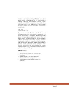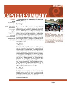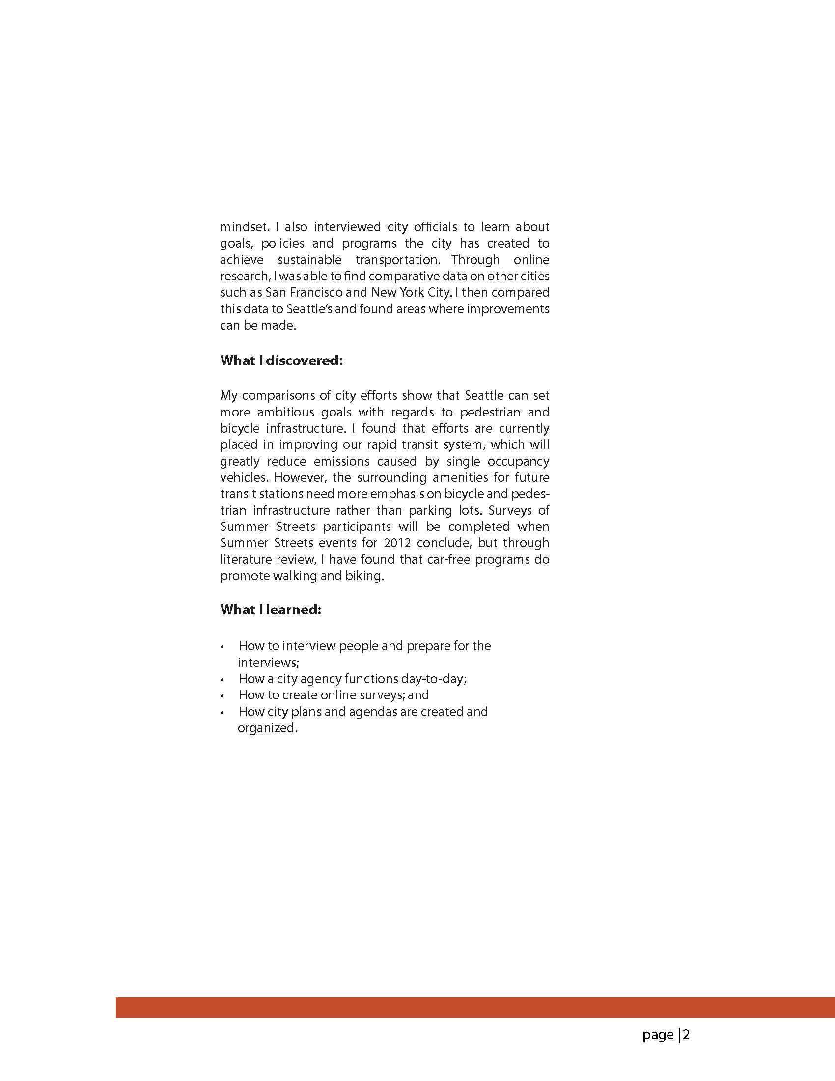 My project was to evaluate means of achieving sustainable transportation. I also analyzed whether our community members saw roads as more than mere routes but as destinations. Shifting views can better our community, and transportation methods. I worked with Seattle Department of Transportation’s Summer Streets to evaluate how the car-free event affected community and environmental behavior. I also compared the city’s goals to other large cities to look possible improvements. The goal of this study is to show how Seattle is a suitable city to become a leader in sustainable transportation and to create recommendations to achieve this.