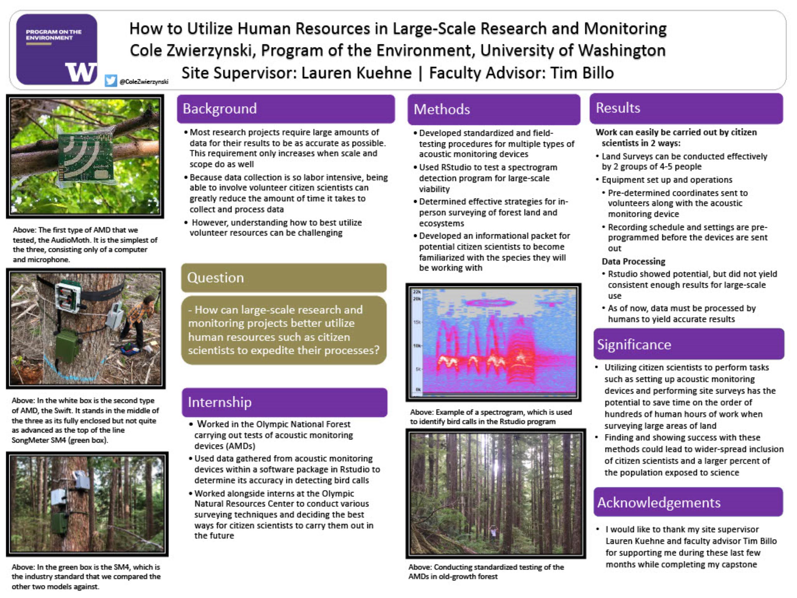 The utilization citizen scientist volunteers, along with automatic sound detection can streamline monitoring projects on the order of hundreds of man hours in terms of data collection and processing. The aim of my internship was to verify the applicability of in-person ecosystem surveys, set-up and operation of acoustic monitoring devices, and to determine if a computer software package could collect results autonomously at the desired level of accuracy for a future experiment that will be carried out by EarthWatch. I worked with my site supervisor to develop and conduct standardized and field tests of our acoustic monitoring devices, along with various types of ecosystem assessments in small teams of people. After our time in the field, I worked in the coding platform RStudio to see if I could fine-tune a software package developed to pick out certain sound signatures within a .wav file. The effectiveness of the Swift recording devices are suitable for the future experiment, however the automatic detection is not able to produce reliable enough results to be relied on entirely on a large scale. Due to the small size and pre- programmability of the recording devices, they could be easily sent to volunteers across the country/globe to be set up anywhere to collect desired data. Despite its inability to provide consistent and accurate counts and detections at this time, automatic detection software shows immense amounts of promise for the near future in this field.