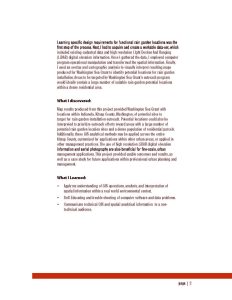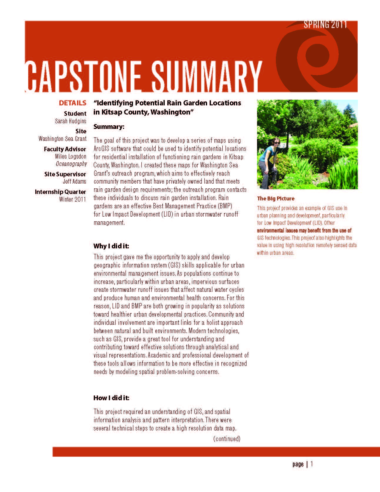 The goal of this project was to develop a series of maps using ArcGIS software that could be used to identify potential locations for residential installation of functioning rain gardens in Kitsap County, Washington. I created these maps for Washington Sea Grant’s outreach program, which aims to effectively reach community members that have privately owned land that meets rain garden design requirements; the outreach program contacts these individuals to discuss rain garden installation. Rain gardens are an effective Best Management Practice (BMP) for Low Impact Development (LID) in urban stormwater runoff