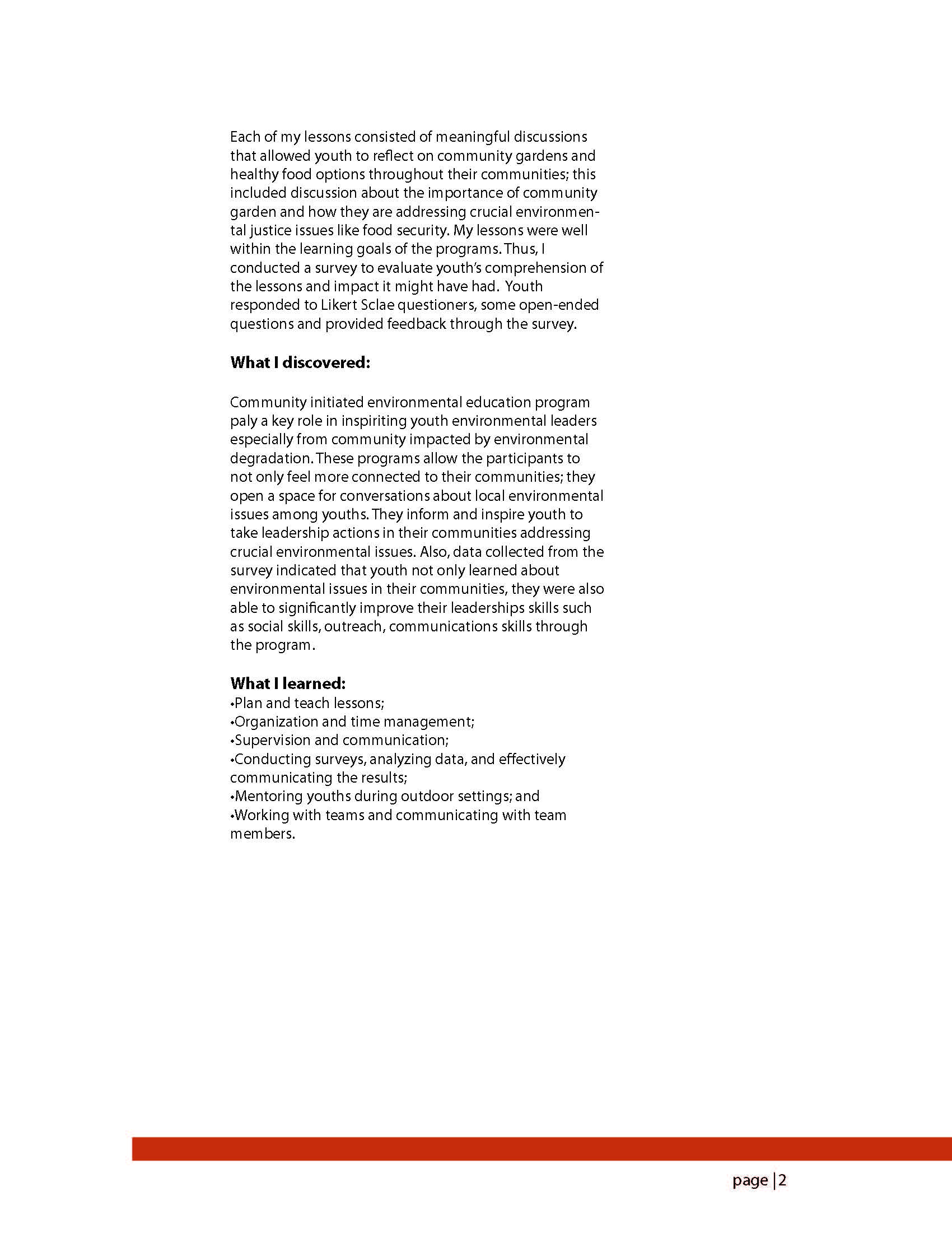 During my internship, I served as one of three leaders for the WILD youth program. My every day task included helping WILD program managers with curriculum, assisting youth participants during discussions and serving as a mentor especially during camping trips. I also incorporated youths learning goals in two lessons on gardening and access to healthy foods in youth’s communities. During my lessons I facilitated meaningful conversations, supervised group discussions, cooking projects and team-building activities. Additionally, I also conduced an end-of-the-program evaluation to analyze the impacts of the program on youths and their engagement on lessons covered.