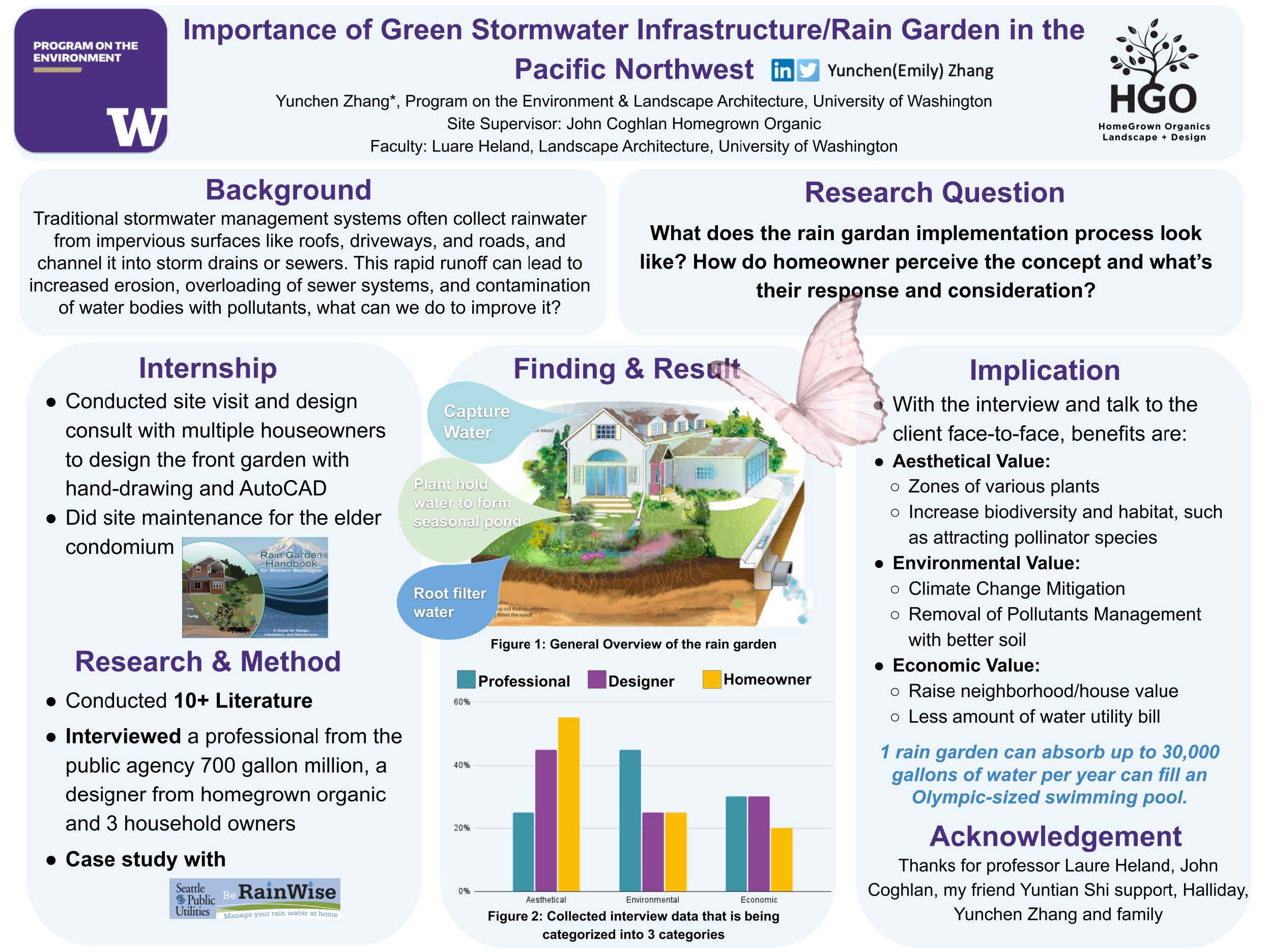 The understanding of nature-based solutions through green infrastructure, especially rain gardens, is an invaluable strategy to our environmental reality as it gives more opportunity for the Great Seattle Area to improve its resiliency on rainfall event and city runoff on a scale that is not feasible through conventional stormwater management (gray infrastructure) alone. The research of collecting responses of rain gardens as a means to influence consciousness and decision making in the future urban green space development, however, is limited by concerns about education expertise, and further knowledge about the greatness of rain gardens. While progress has been made, the implication is still in need of improvement to maximize its impact on our management of environmental issues. During this time assisting with HomeGrown Organics visiting and conducting garden design for homeowners during the pandemic period, the author evaluated factors that influence a homeowner’s acceptance to install a rain garden with the assumption that an emphasis on those factors will enable the determination. To accomplish this, the research compile of 12 scholarly peer-review papers with the key world concentration of climate adaptation, benefits and well-being rain garden cases that have been successfully done by public agencies previous to on-site research as a way to evaluate their level of application. I then collected the positive and challenging aspects of the homeowners, professionals, and public agency officer’s reaction and administered 3 face-to-face interviews through both online meeting and in person form around 20 minutes, which allowed interviewees to answer in depth about their perception of the GSI concept. With this information, I found rain gardens increase water quality, increasing urban biodiversity, enhance property value, bolstering physical and mental well-being and create sense of neighborhood worthy of land-planning investment, detailed reference materials, and multiple meetings to increase the consistency and quality of the data produced and therefore bolster the impact of the field.