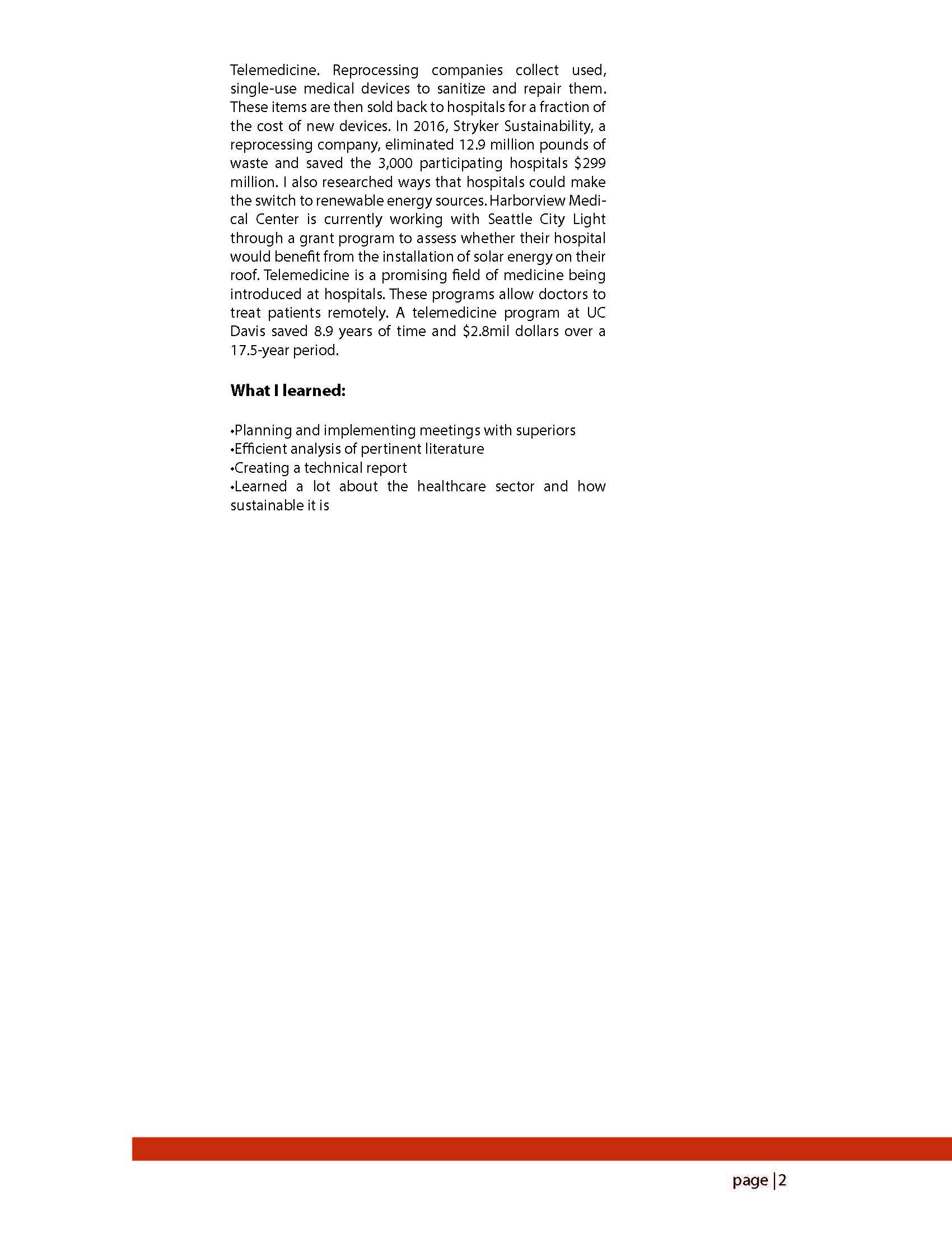 My internship was with UW Sustainability working on their Greening Health Sciences Initiative. This initiative’s purpose is to identify opportunities to improve the sustainability of the UW Health Sciences. My project was aimed at the local Seattle hospitals managed by the University of Washington including Harborview and UW Medical Centers. My site supervisor and I chose to focus on the GHG emissions and waste produced by these hospitals to and a way to decrease them in the future.