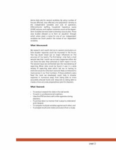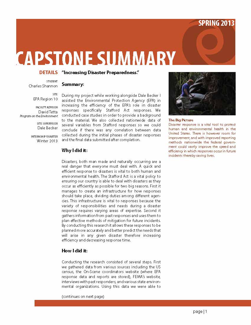 During my project while working alongside Dale Becker I assisted the Environmental Protection Agency (EPA) in increasing the efficiency of the EPA’s role in disaster responses specifically Stafford Act responses. We conducted case studies in order to provide a background to the material. We also collected nationwide data of several variables from Stafford responses so we could conclude if there was any correlation between data collected during the initial phases of disaster responses and the final data submitted after completion.