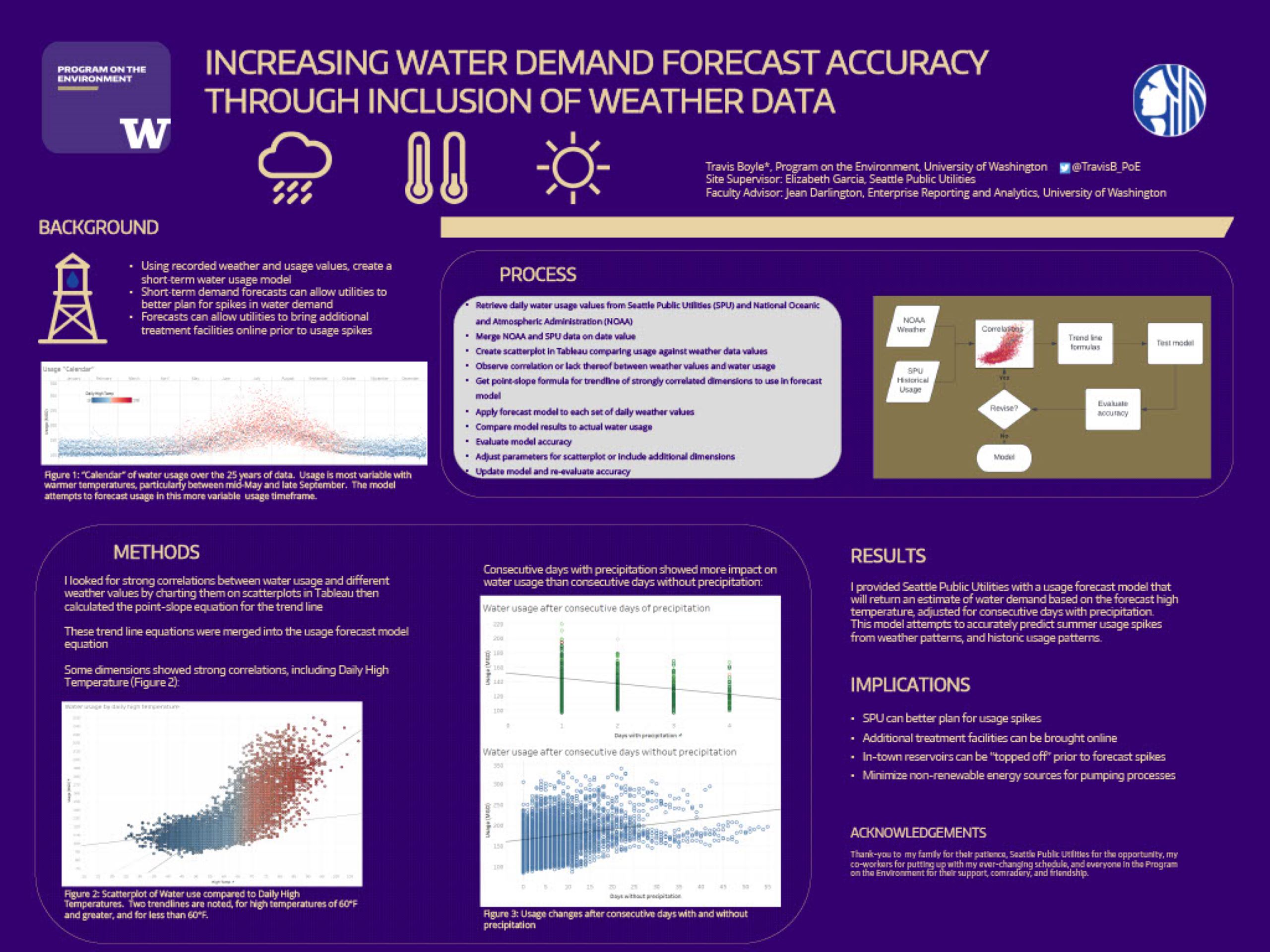 Municipal water utilities can improve efficiencies using short-term demand forecasting. These short-term forecasts can be improved by including weather factors in the forecast modeling. This project provides Seattle Public Utilities (SPU) with a model to generate a more accurate water demand forecast by factoring weather data. To do so, I merged historic SPU usage data with historic weather data as provided by the National Oceanic and Atmospheric Administration (NOAA). I charted usage against individual weather values, to look for strong correlations, and found that temperature and consecutive days with precipitation were strongly correlated with changes in water usage. I used the trendlines of these charts to build a mathematic formula that given the daily high temperature and number of prior consecutive days of rain will output a water demand forecast. I then tested this model against the historical usage values. This model returned projected demand values with an average error of about 10%, an improvement over the previously available short-term forecasts. By integrating these demand forecasts with existing processes, SPU can have early warning of leakage issues. Additionally, ideally SPU will be able to schedule energy intensive processes like groundwater pumping at a time that can make the most advantage of intermittent renewable energy sources.