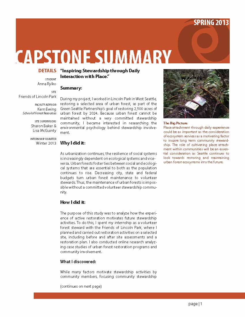 During my project, I worked in Lincoln Park in West Seattle, restoring a selected area of urban forest, as part of the Green Seattle Partnership’s goal of restoring 2,500 acres of urban forest by 2024. Because urban forest cannot be maintained without a very committed stewardship community, I became interested in researching the environmental psychology behind stewardship involvement.