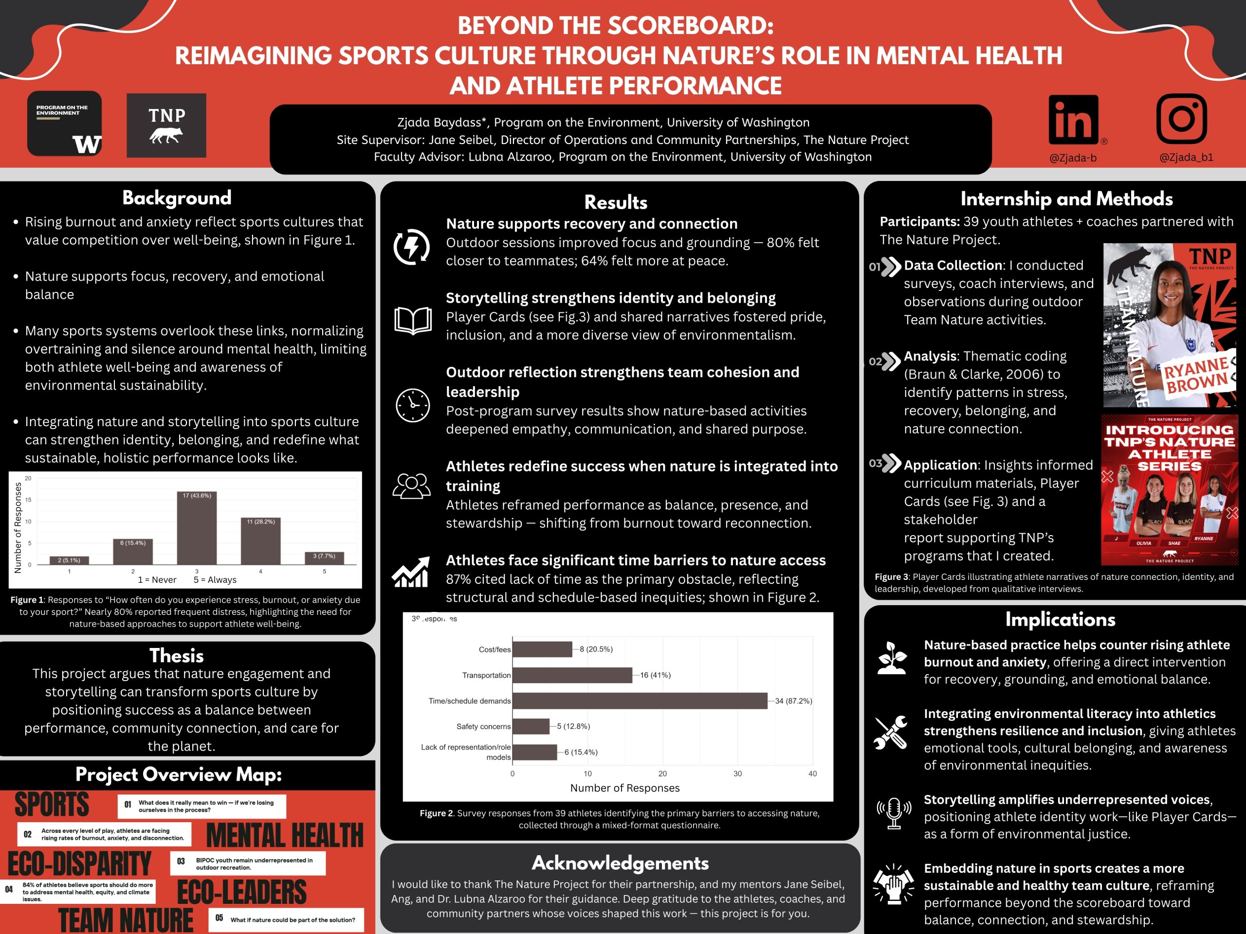 Across all levels of play, athletes are facing rising rates of burnout, anxiety, and disconnection—challenges often overlooked in sports systems that prioritize competition over well-being. At the same time, growing evidence shows that time in nature enhances focus, recovery, and mental health. This project bridges those worlds, redefining “performance” by integrating environmental awareness and emotional wellness into athletic culture. Through my internship with The Nature Project, I collaborated with athletes, coaches, and community partners to gather data through surveys, interviews, and field activations. These engagements explored how nature-based practices and reflective storytelling—such as the Team Nature Athlete Series—can shape well-being, leadership, and team dynamics. Survey data from 39 athletes revealed that over 50% experience burnout or anxiety regularly due to their sport. That’s not a small number—it’s a culture issue, reflecting a system that normalizes overtraining, pressure, and silence around mental health. Similarly, 87% of athletes reported time constraints as the main barrier to accessing nature, signaling that the issue isn’t a lack of interest but a lack of design. In a post-activity survey, when outdoor experiences were integrated into team settings, 80% of athletes reported feeling more connected to teammates, 69% more reflective about their leadership, and 64% more grounded or at peace. These findings indicate that nature engagement is not an extracurricular benefit but a critical intervention for mental health, belonging, and leadership in sports. The Team Nature framework goes beyond the scoreboard, redefining winning as a balance between performance, connection, and care for the planet.