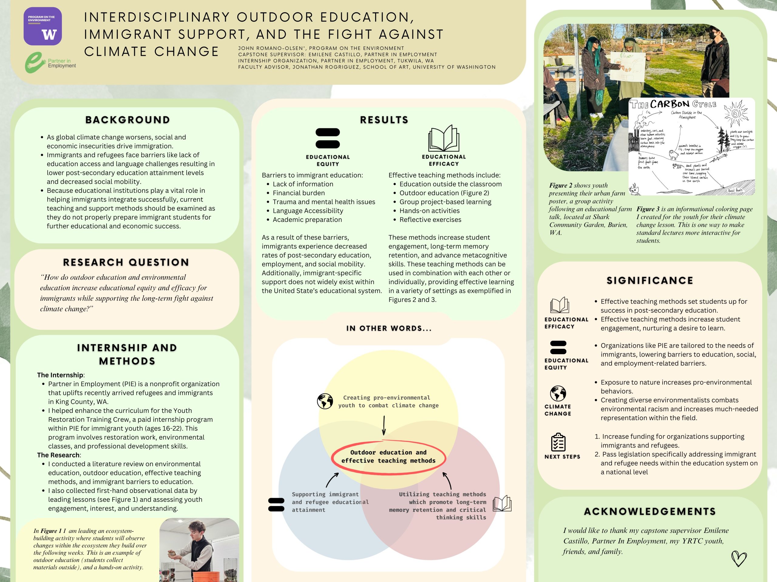 The current educational system in the United States does not properly support immigrant and refugee students as a result of systemic educational barriers. Consequently, disparities in educational attainment, social mobility, and employment disproportionately impact immigrant populations compared to those who are native-born. The purpose of this study is to illustrate how utilizing interdisciplinary environmental teaching methods can properly support immigrant needs while also promoting environmentalism to combat anthropogenic climate change. For my internship I created informed lesson plans and activities for a program focused on restoration work, environmental education, and job training skills serving immigrant youth in King County. I collected results through a comprehensive literature review, qualitative observations, and quantitative data collection. I found that using education outside the classroom, group project-based learning, reflective exercises, and hands-on learning were most effective at increasing youth engagement and metacognitive skills. Additionally, spending time and learning outdoors increases environmental caring, spurring pro-environmental behaviors. Therefore, by utilizing more effective teaching methods, educators can promote educational equity for immigrant and refugee students while simultaneously creating individuals who support climate action.