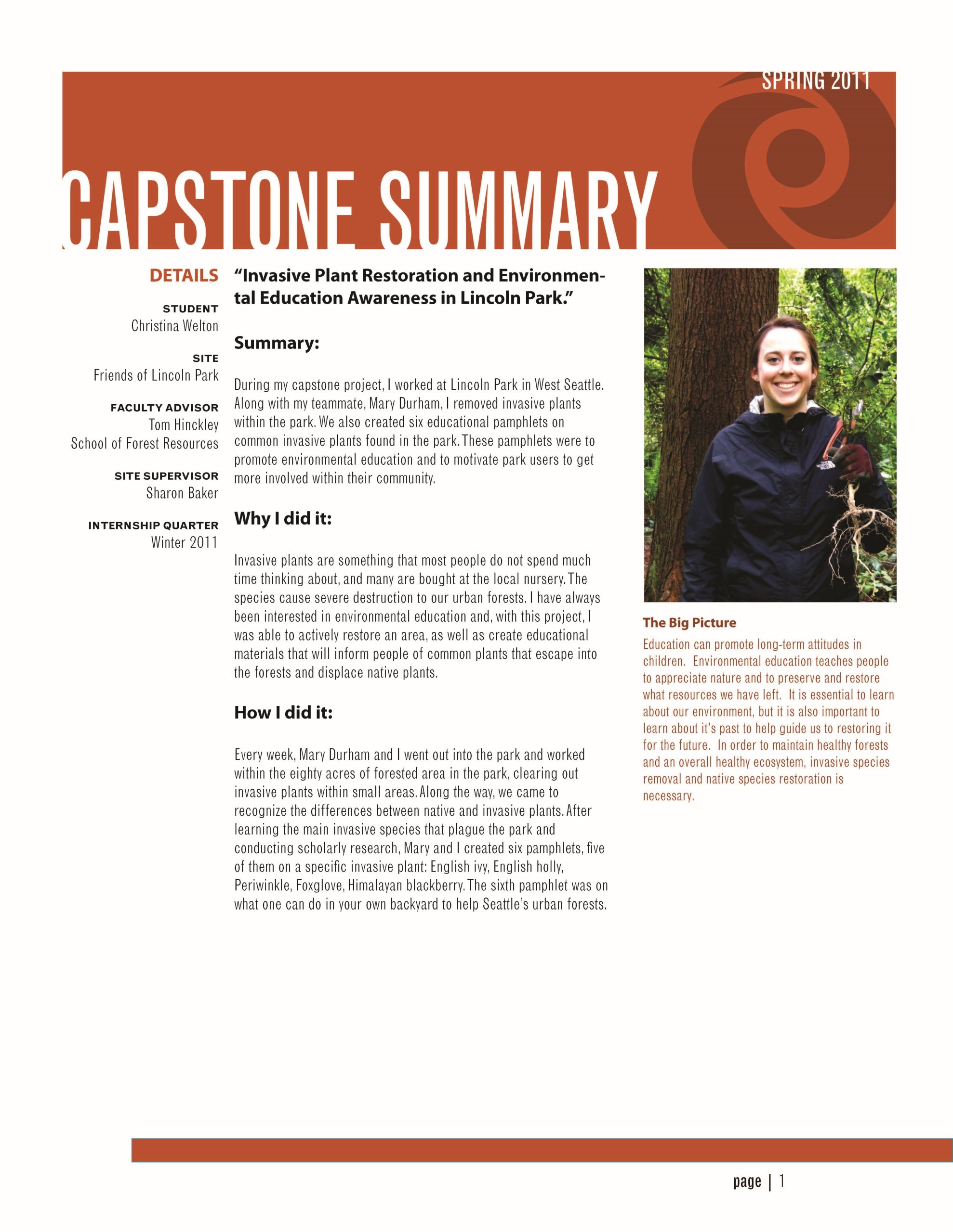 During my capstone project, I worked at Lincoln Park in West Seattle. Along with my teammate, Mary Durham, I removed invasive plants within the park. We also created six educational pamphlets on common invasive plants found in the park. These pamphlets were to promote environmental education and to motivate park users to get more involved within their community.