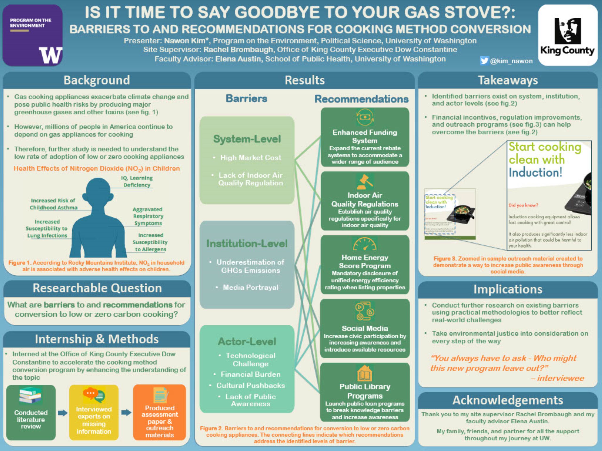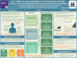 Studies have shown that cooking appliances are one of the sources of major greenhouse gases such as methane and nitrogen dioxide, which exacerbates climate change and puts public health at risk by posing health risks when inhaled. Low or zero carbon cooking equipment such as the conventional electric stoves and the induction stoves are available on the market. However, millions of homes in America continue to depend on gas appliances for cooking. This research aimed to identify the barriers to conversion from gas to low or zero-carbon cooking equipment and provide recommendations addressing the identified barriers for King County. To accomplish this task during my internship with King County, I conducted extensive literature reviews and three interviews with experts. All the research findings were compiled to create a Cooking Methods, Climate, and Health assessment paper and sample outreach materials for the King County to use as a starting point to promote the cooking method conversion. The findings showed systematic, institutional, and actor-level barriers to the cooking method conversion, which can be overcome through political, institutional, and financial recommendations. The identified barriers to the cooking method conversion exist on multiple levels, and interdisciplinary actions are necessary to overcome the barriers and increase cooking method conversion successfully. The increase in cooking method conversion will have long-term environmental benefits by reducing the county’s greenhouse gas emissions and also have public health benefits by eliminating the potential health risk factor.