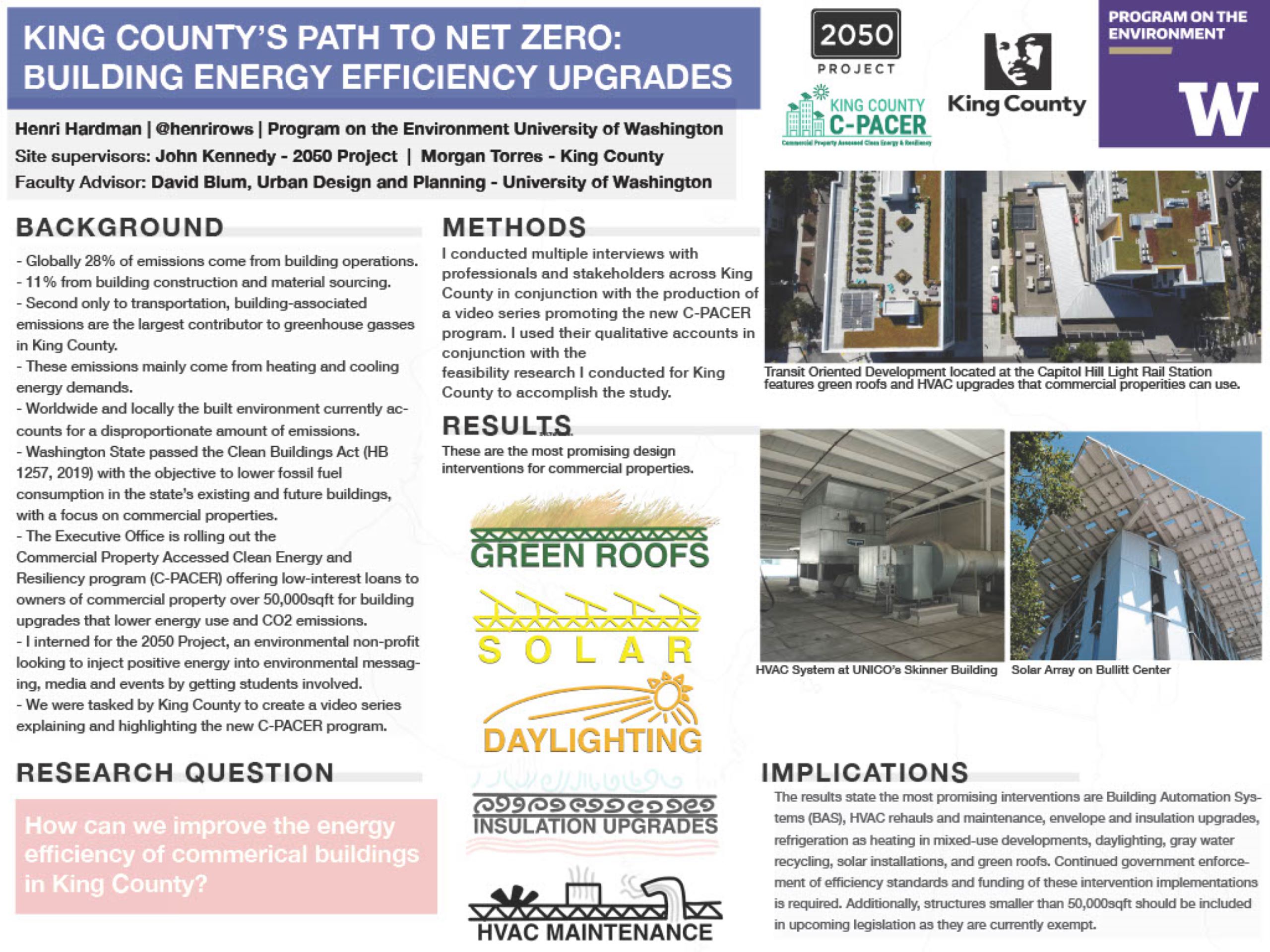 Globally 28% of emissions come from building operations and 11% from building construction and material sourcing. Second only to transportation, building-associated emissions are the largest contributor to greenhouse gasses in King County. Worldwide and locally the built environment currently accounts for a disproportionate amount of emissions. Washington State passed the Clean Buildings Act (HB 1257, 2019) with the objective to lower fossil fuel consumption in the state’s existing and future buildings, with a focus on commercial properties. The Executive Office is rolling out the Commercial Property Accessed Clean Energy and Resiliency program to offer low-interest loans to owners of commercial property over 50,000sqft for building upgrades that lower energy use and CO2 emissions. The purpose of this study was to identify and market feasible solutions and building upgrades to be implemented on structures and properties in King County. I conducted multiple interviews with professionals and stakeholders across King County in conjunction with the production of a video series promoting the new CPACER program. I used their qualitative accounts in conjunction with the feasibility research I conducted for King County to accomplish the study. The results state the most promising interventions are Building Automation Systems (BAS), HVAC rehauls and maintenance, envelope and insulation upgrades, refrigeration as heating in mixed-use developments, daylighting, gray water recycling, solar installations, and green roofs. Continued government enforcement of efficiency standards and funding of these intervention implementations is required. Additionally, structures smaller than 50,000sqft should be included in upcoming legislation as they are currently exempt.
