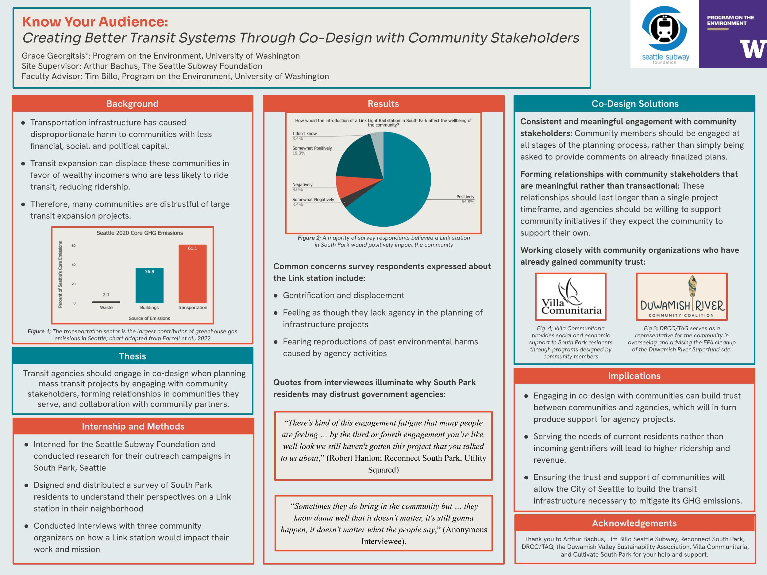 The looming threat of global climate change has intensified scrutiny of our nation’s transportation infrastructure, which is the largest contributor to carbon emissions. Expanding mass transit systems could be key to reducing these emissions, yet many individuals are distrustful of large transit agencies, fearing that their needs and the unique characteristics of their communities will be overlooked in the planning process. While transit agencies possess the technical expertise necessary for designing transit systems, grassroots organizations are better equipped to understand the social context of the communities they serve and can effectively build trust among local residents. By engaging in co-design with community stakeholders, transit planners can foster collaboration that addresses the distinct needs of these communities and create a more effective transit system in the process. This study aims to explore the perspectives of South Park, Seattle residents around a Link light rail station in their neighborhood. I conducted three interviews with community organizers and distributed a survey that received nearly 90 responses in one month. The results revealed that a majority of participants supported the addition of a Link station in South Park, but many expressed concerns about potential gentrification, displacement, and changes in community character. My findings underscore the importance of proactive outreach to communities sited for future transit projects and collaboration with local grassroots organizations. By collaborating with these organizations, transit planners can create systems that serve the community’s needs and get people out of their cars and onto mass transit.