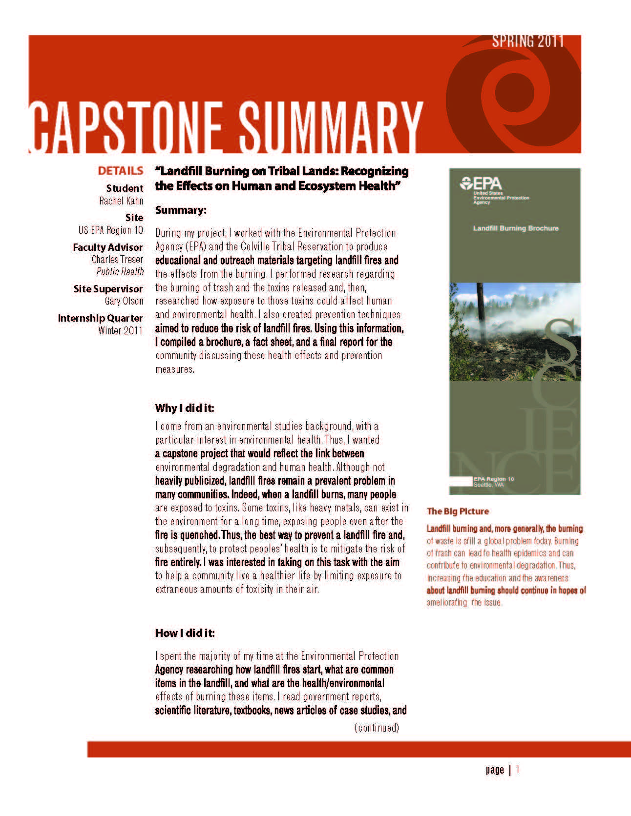During my project, I worked with the Environmental Protection Agency (EPA) and the Colville Tribal Reservation to produce educational and outreach materials targeting landfill fires and the effects from the burning. I performed research regarding the burning of trash and the toxins released and then, researched how exposure to those toxins could affect human and environmental health. I also created prevention techniques aimed to reduce the risk of landfill fires. Using this information, I compiled a brochure, a fact sheet, and a final report for the community discussing these health effects and prevention measures.