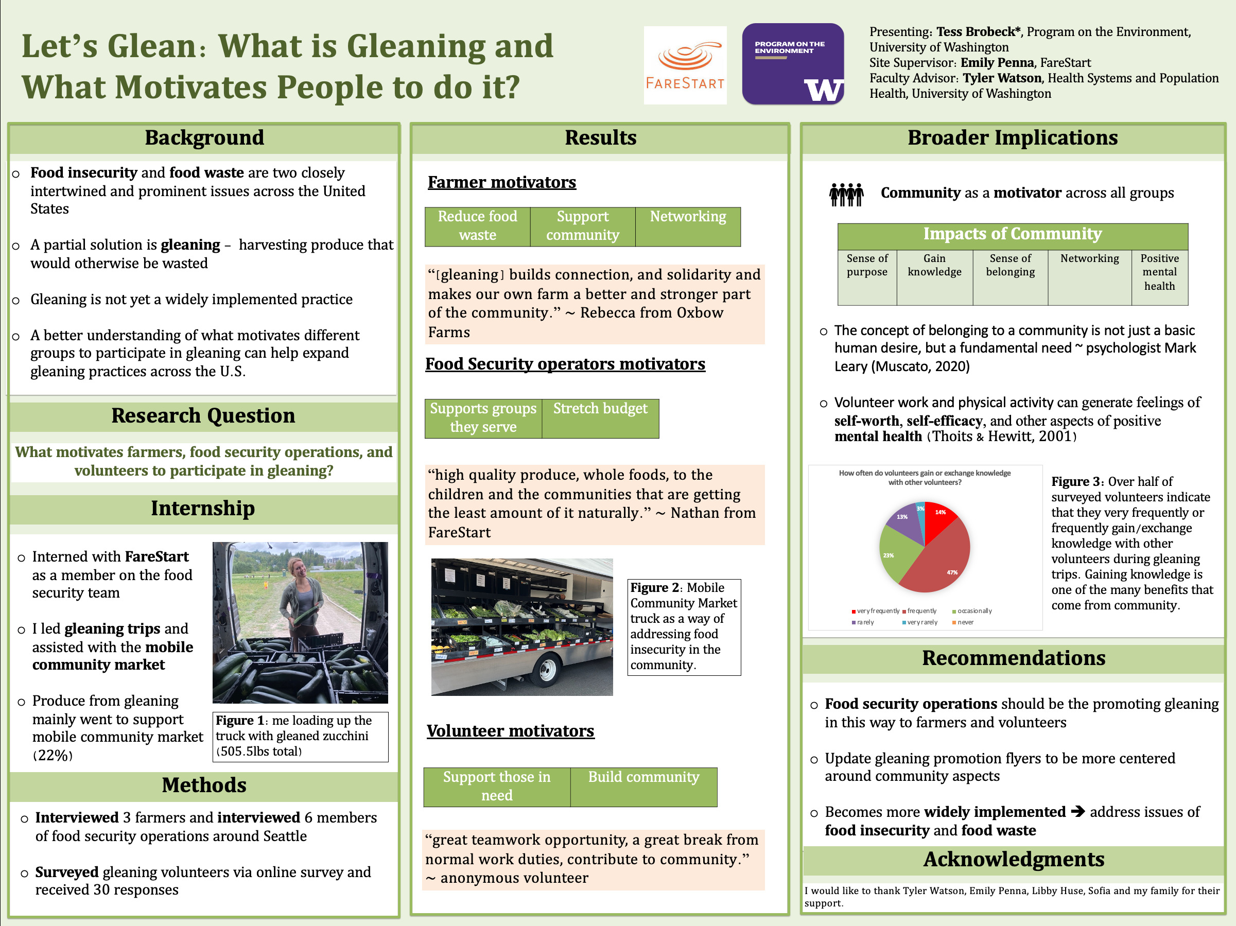 Food insecurity and food waste are two closely intertwined and prominent issues in the United States. Millions of people struggle to have access to healthy food and about 40% of foods meant for human consumption end up going to waste. Not only are wasteful practices taking food away from those in need, but food waste also significantly contributes to greenhouse gas emissions. The solution lies in gleaning, or harvesting produce that otherwise would be wasted. I interned with FareStart as a member of their food security team and helped lead gleaning trips to support their mission. My research aimed to address what motivates farmers, food security operations, and volunteers to participate in gleaning practices. I conducted interviews with farmers and others involved in food security operations (FareStart and similar organizations) and also surveyed gleaning volunteers to address this essential question. While each group indicated several drivers that motivate participation, all had one factor in common: community. Farmers were focused on building community relationships, volunteers were most interested in community building practices and altruism, and food security operation members were intent on giving back to local communities facing food insecurity. These groups valued different outcomes associated with gleaning; their results help to identify the most successful means to motivate future participation. Gleaning is often overlooked for its effectiveness in addressing issues of food insecurity and food waste management. It is important for gleaning to be promoted in the most fruitful way possible so that it can become more widely implemented.