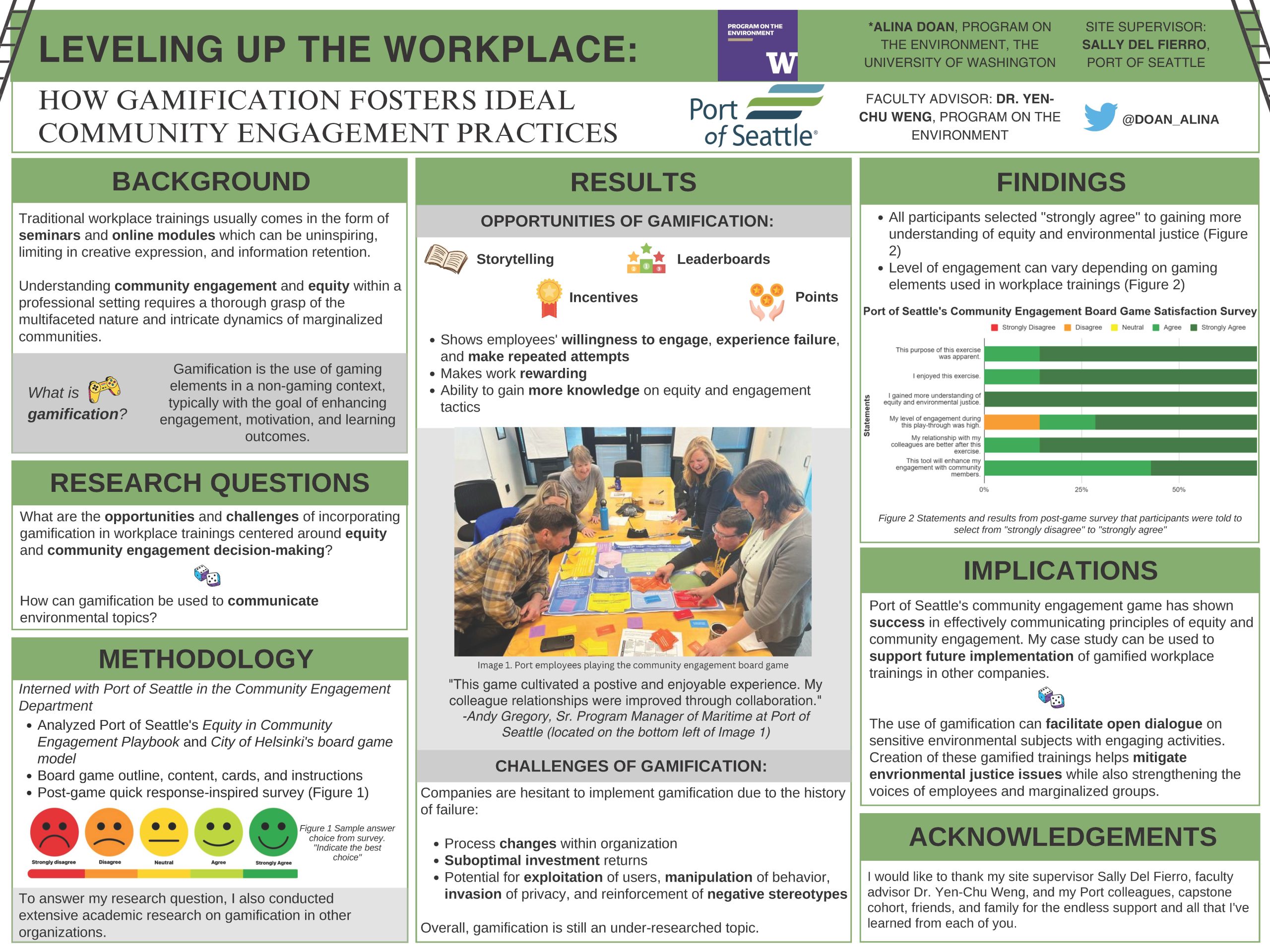 Traditionally, workplace training can be boring to attend when the content could be more engaging and interactive with participants. Essential topics of equity and community engagement need to be fun and easily applicable to real-life scenarios. Mastering community engagement as a form of communication with key stakeholders addresses environmental justice issues and has the ability to earn trust and build relationships with marginalized communities. It gives value, meaning, and significance to the individuals being represented. The purpose of this study was to understand the opportunities and challenges of gamification in workplace training centered around equity and community engagement decision-making and how developing an engaging and educational tool can be utilized to communicate environmental topics. I interned with the Port of Seattle and focused my efforts on creating a community engagement board game catered to train employees on best engagement practices during Port-related projects. The game content included clear rules, storytelling, timers, and collaborative and strategic elements that allowed quality engagement between all players. I also conducted a post-interview to evaluate participants on the effectiveness of gamification. As a result, players expressed high engagement, enjoyability, more understanding of equity, better relationships with colleagues, and the proposed application of workplace training. This information unveiled the possibility for gamification to be used to communicate any environmental topics which helped me understand how to empower communities and stakeholders in future outreach efforts in addition to educating those that have difficulty in understanding environmental justice.