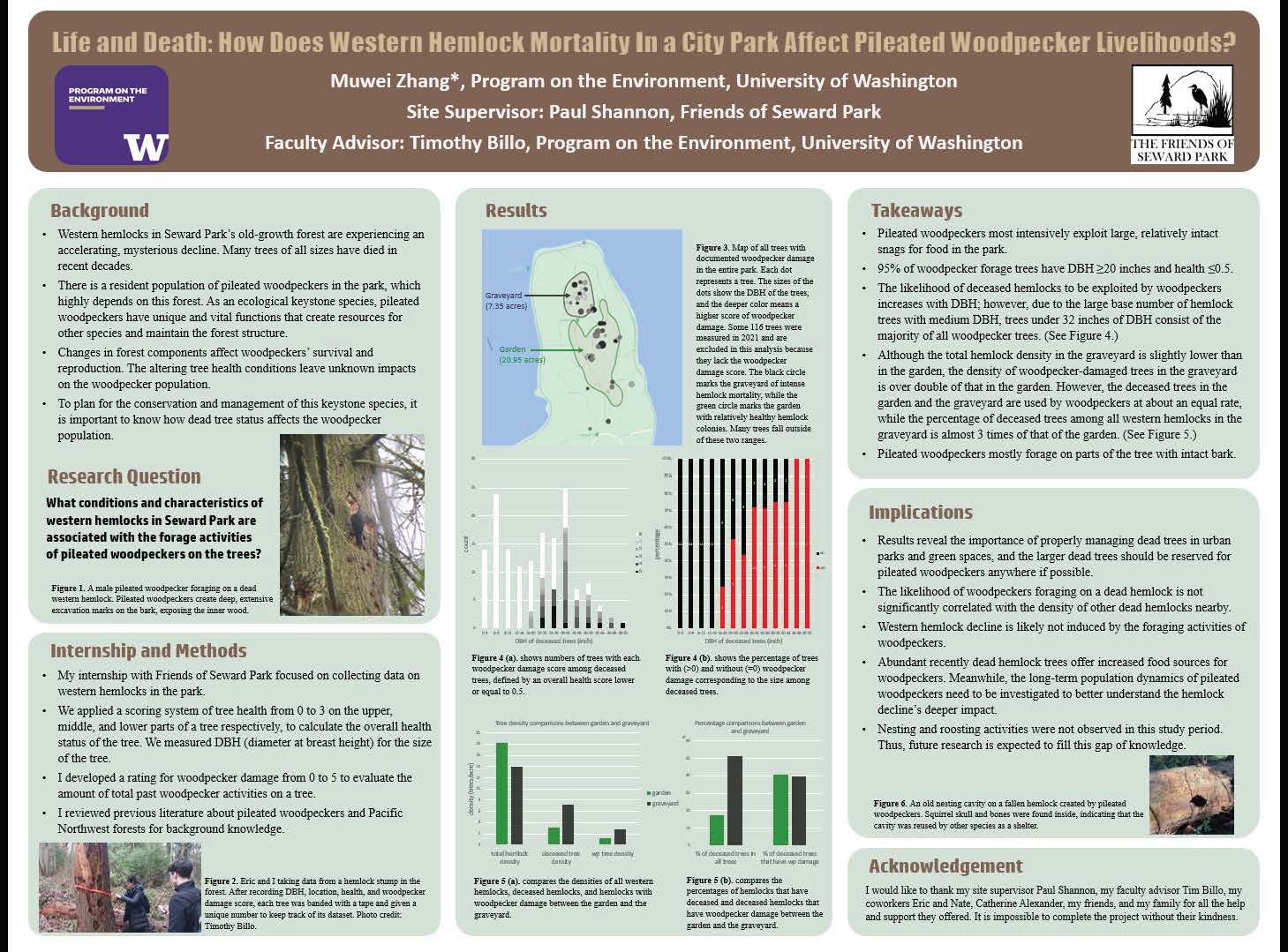 Urban parks are important environments to support native ecosystems. Western hemlocks in Seward Park’s old-growth forest are experiencing a health crisis that causes them to die at a concerning rate. This forest supports a resident pileated woodpecker population, which has irreplaceable functions for the local ecosystem. Both living and dead trees are vital resources for animals living in the forest, especially woodpeckers. Therefore, the altering hemlock survival and health leave unknown impacts on the population of woodpeckers. My study aims to look at the health condition of western hemlocks in the park and how it is associated with the pattern of pileated woodpecker activities. Working with Friends of Seward Park, I identified western hemlocks in the forest and took a set of feature data from each tree. I recorded any pileated woodpecker activity I encountered in the forest and set up camera traps for spot monitoring. According to my data, pileated woodpeckers most intensively exploit large, relatively intact snags for food and nesting in the park. Their activity level is significantly higher in the hemlock graveyard, defined by the most concentrated deceased hemlocks, than in other parts of the park. Western hemlock mortality is not likely caused by woodpecker activities because they almost only occur on already dead trees. My results show the importance of managing woody debris in urban parks. Further research on the population dynamics of pileated woodpeckers should be conducted to monitor the long-term trends, responding to unknown future development of hemlock mortality.