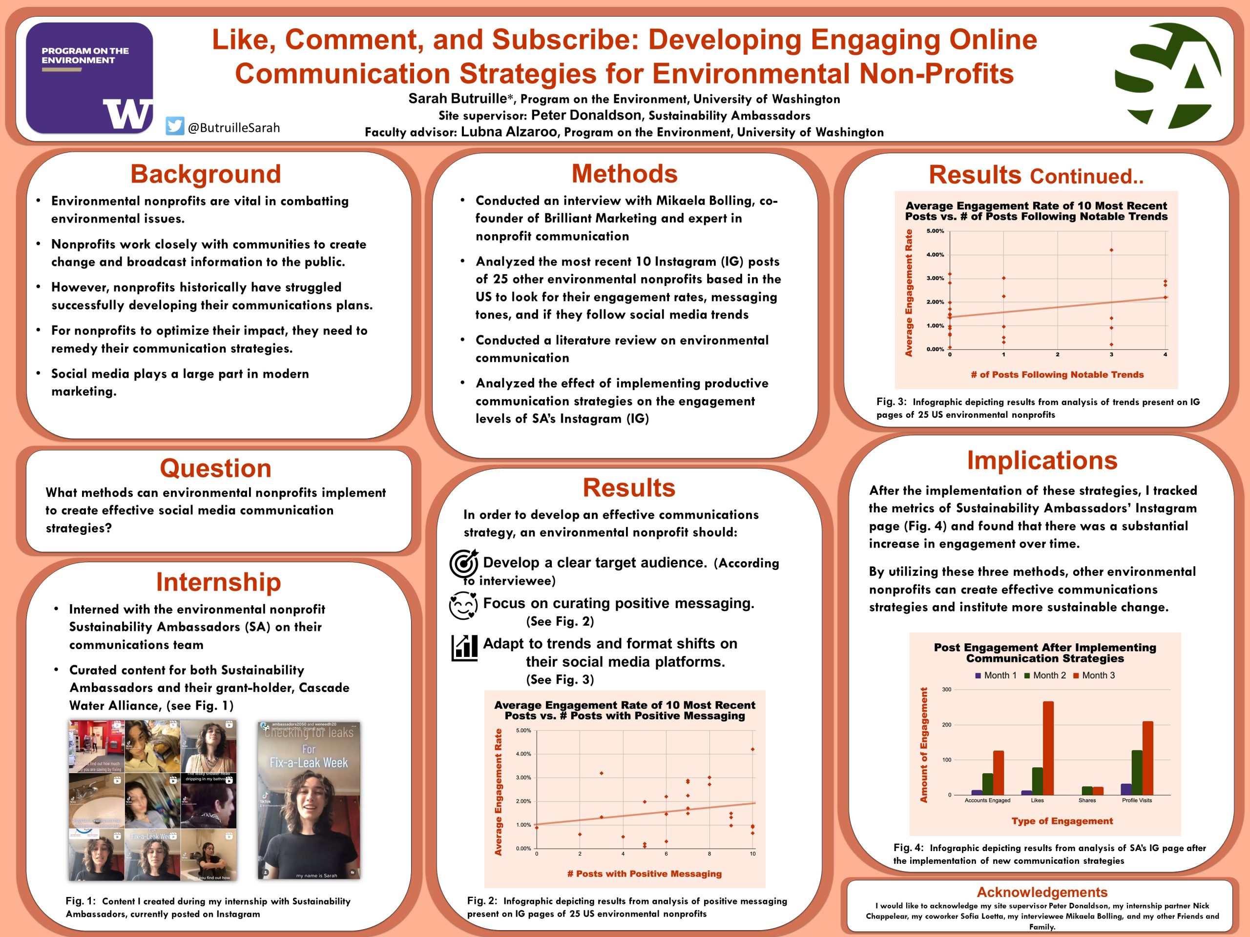 Nonprofit organizations are incredibly important in combatting environmental issues, as they connect communities with environmental action and act independently from the government to quickly implement change. However, these organizations have historically struggled with developing marketing/communications strategies in our for-profit world, limiting their impact. With the rise of social media, all nonprofits, including environmental ones, have had to alter the formats with which they communicate to their audiences, adding another hurdle to developing their marketing plans. The purpose of this study was to understand how to utilize social media to create effective communication strategies for environmental nonprofits such as Sustainability Ambassadors (SA). To accomplish this, I completed an internship with SA and personally curated content for them and their grant-holder, Cascade Water Alliance, as well as conducting an interview with an expert in nonprofit marketing and a literature review on environmental communication. I also analyzed the Instagram pages of various environmental non-profits across the country, their content formats, and their engagement levels. Findings show that to engage a broad online audience most effectively, environmental nonprofits should develop a clear target audience, focus on curating positive messaging, and adapt to trends and format shifts on their social media platforms. Through developing a more effective communications strategy, environmental nonprofits can institute more sustainable change.