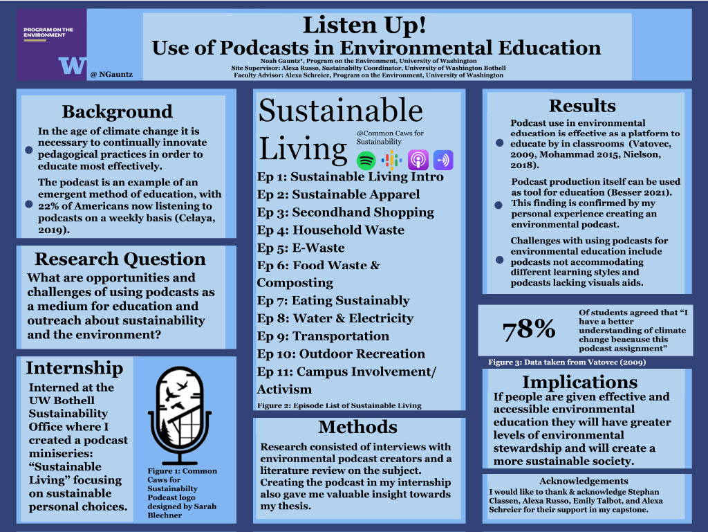 With the increasing severity and urgency needed in fighting climate change, it is critical to evaluate factors that are preventing sustainable change from occurring. One factor is the lack of sufficient education in the realm of the environment. This is evident in the fact that a third of Americans do not believe climate change is human caused (Leiserowitz, 2021). New methods of education must be evaluated to understand how to educate about the environment most effectively. I explore this idea in my research question: what are opportunities and challenges of using podcasts as a medium for education and outreach about sustainability and the environment? This project consisted of me undergoing an internship with UW Bothell’s Sustainability Office where I created an environmentally themed podcast. I also conducted a literature review on the topic and interviewed environmental podcast creators. My main findings are that podcasts have practical applications as educational tools in environmental education both inside and outside of classroom settings. I also found that the creation of podcasts itself is an emergent educative tool, confirmed by my literature review and my experience in creating an environmental podcast. Finally, I found that the use of podcasts only has slight challenges in environmental education, such as the fact that environmental education can be situationally reliant on visual aids. This information is important in understanding the most effective methods of environmental education, the foundation of nurturing a more sustainable society.