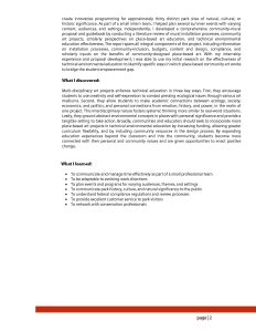For my project, I was interested in how environmental education can be more effective at empowering students to use their technical knowledge to become active stewards in their own neighborhood. To accomplish this, I worked with the George Washington Memorial Parkway National Park Service to research, develop, and implement art installations and nature programs at various park sites. Through my scholarly research and hands-on experience, I found that place-based community art is an advantageous tool that strengthens student stewardship by integrating several interconnected disciplines in the scope of one project, grounding issues in a personal setting, and encouraging creative expression.