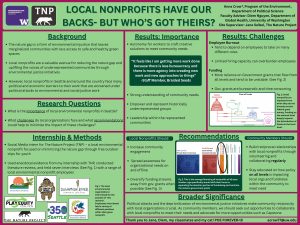 While nonprofit work is generally celebrated in this country, it often emphasizes the achievements of major nonprofits and forgets the crucial work that small, localized nonprofits do in their community. The purpose of my research was to determine the role that local environmental nonprofits play in Seattle, and evaluate their successes and challenges. In the midst of increased political threats to nonprofit work, I was curious to understand both the preexisting and more recent challenges faced by smaller, local nonprofits. To investigate this question, I used my firsthand experience as a social media outreach intern with a local nonprofit, The Nature Project, in addition to interviewing nonprofit employees and conducting independent research. Through this, I determined that local nonprofits play a vital role in resource sharing and community building in Seattle. Their success is largely due to their close community ties that equip them to meet and advocate for local needs best. However, many challenges were identified, with two primary concerns being funding instability and employee burnout. With these preexisting problems being exacerbated by current administrative behavior, I determined that funding diversification and increased community engagement are best practices for nonprofits to protect their work. Additionally, as local environmental stewards, we must help protect local nonprofits through fundraising and donating, as well as advocating and volunteering with them. While there are steps that local nonprofits can take to protect themselves in times of instability, it is crucial for us to support local nonprofits– the way they do for us.