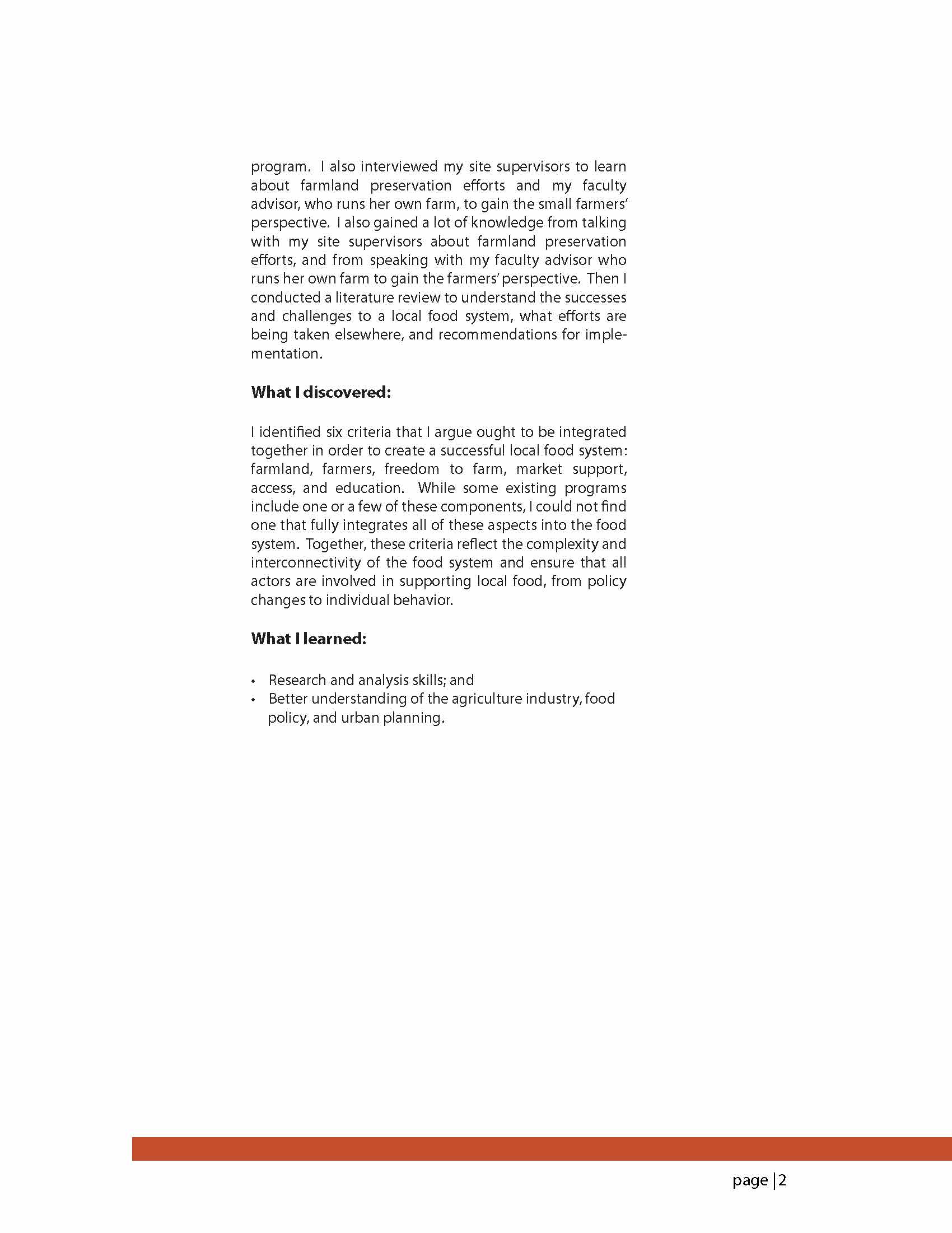 I completed my capstone internship at the American Farmland Trust, a national nonprofit dedicated to farmland preservation. Throughout the quarter I helped them prepare a conference for city and county officials in the Puget Sound region to learn about how to plan for local food in their areas. In doing so, I read a lot of literature about the growing local food movement and decided to write my analysis paper on the steps to developing successful local food systems in the Puget Sound and beyond.
