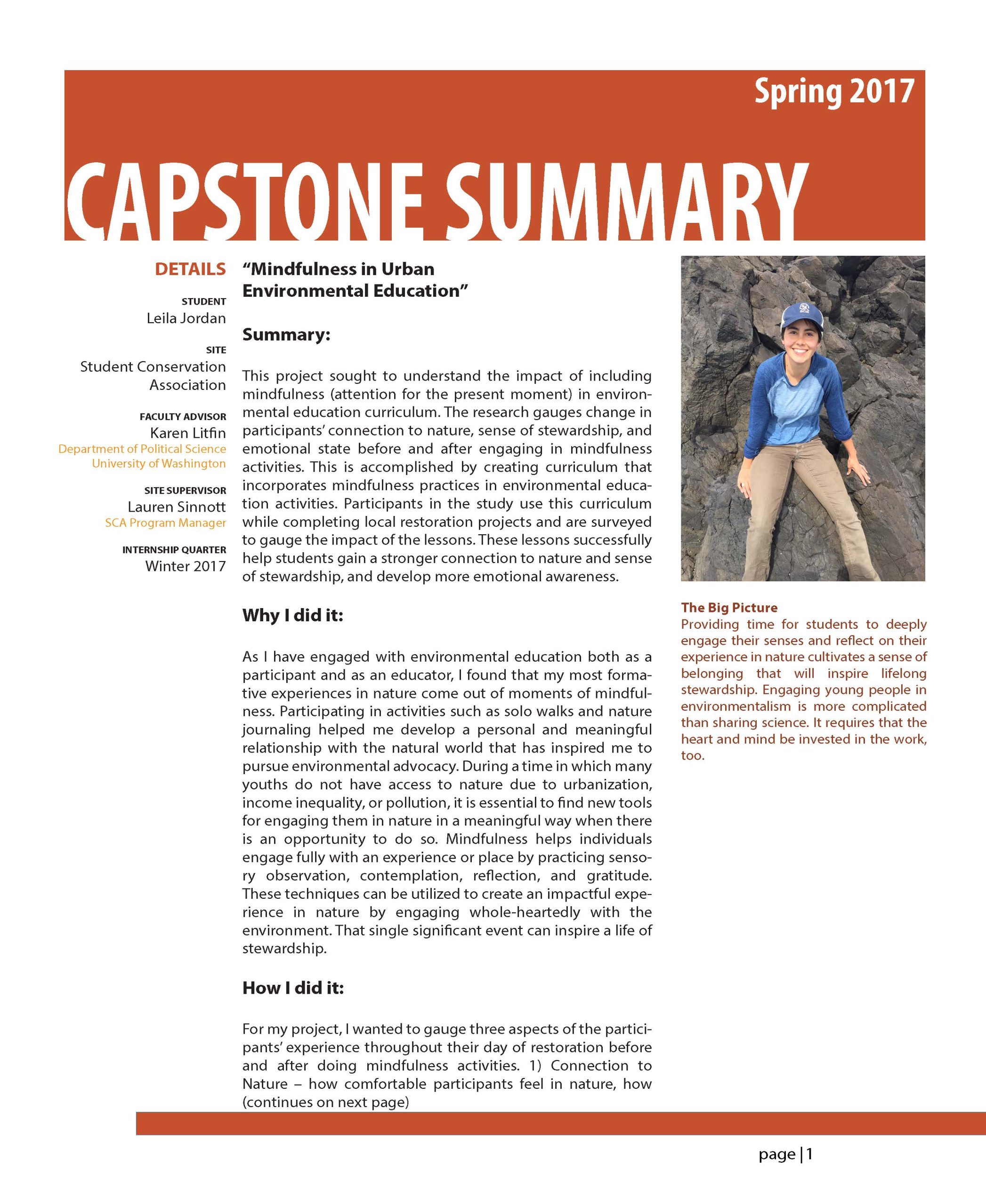 This project sought to understand the impact of including mindfulness (attention for the present moment) in environmental education curriculum. The research gauges change in participants’ connection to nature, sense of stewardship, and emotional state before and after engaging in mindfulness activities. This is accomplished by creating curriculum that incorporates mindfulness practices in environmental education activities. Participants in the study use this curriculum while completing local restoration projects and are surveyed to gauge the impact of the lessons. These lessons successfully help students gain a stronger connection to nature and sense of stewardship, and develop more emotional awareness.
