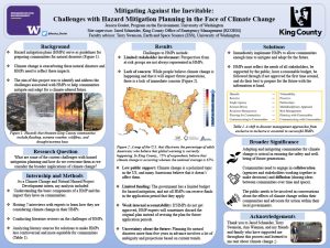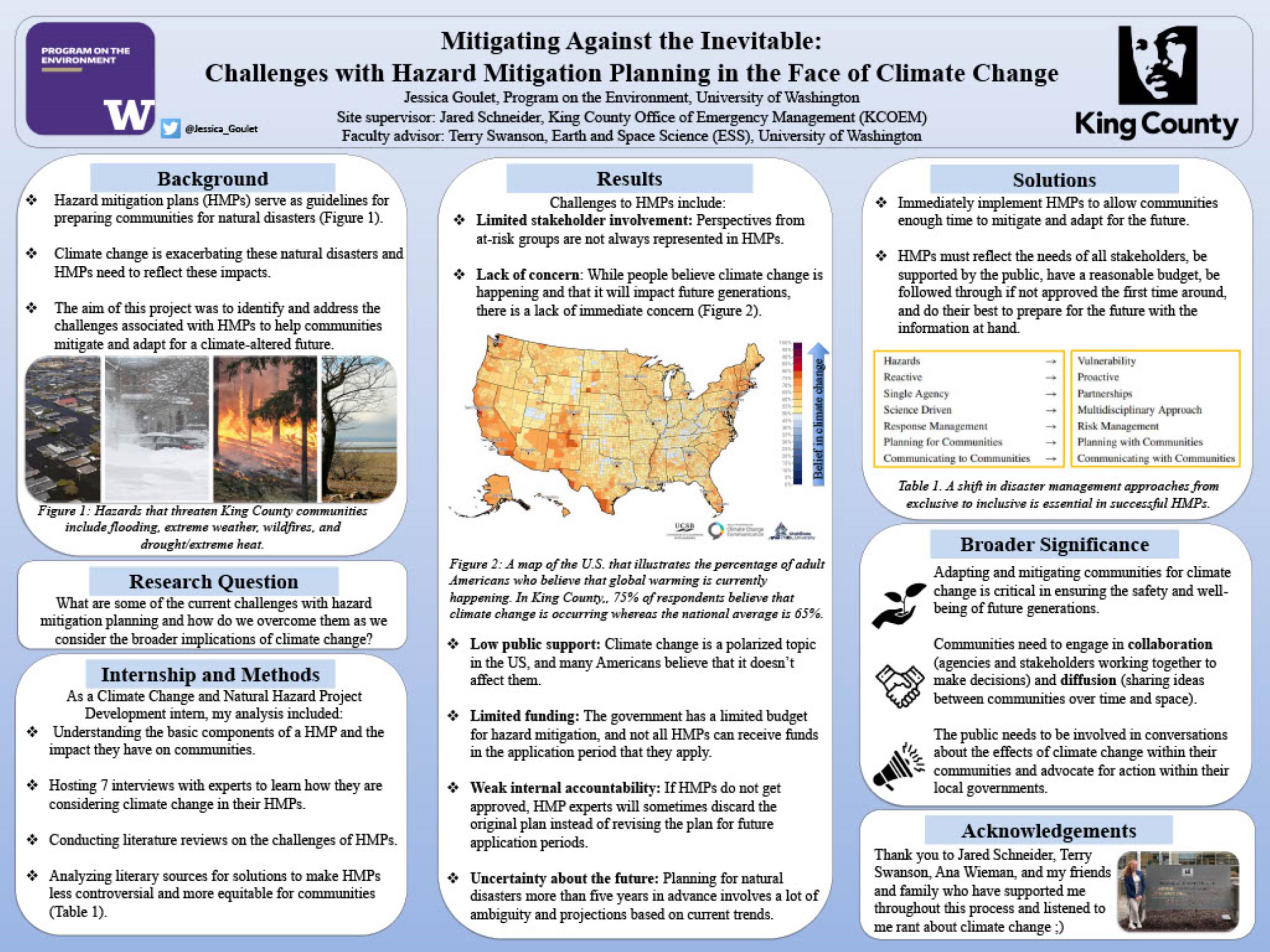 It is without a doubt that climate change has and will continue to have adverse effects on the environment and future generations. We have run out of time to simply react to climate change and its associated natural hazards, and instead, we must become proactive and act quickly to mitigate and adapt communities for a future with increased risk. The purpose of my research was to understand some of the challenges associated with hazard mitigation planning and how we can address those obstacles while considering the implications of climate change. I discovered that Hazard Mitigation experts deliberately incorporate or avoid specific approaches, methods, wording, and information when writing their hazard mitigation plans (HMP) to increase their likelihood of being approved, receiving funding, and ultimately having a positive impact on the community of interest. However, it is crucial that our HMPs reflect the climate crisis at large and address the current needs of our communities while considering the impacts of exacerbated natural disasters. Regardless of how much we prepare for the future, climate change will indefinitely impact Washingtonians in all aspects of their lives with exponentially increasing frequency and intensity. Life as we know it will look very different in the following decades and will be laden with even more environmental challenges. In order to reduce some of the most negative impacts of climate change, we need to start implementing quality HMPs into communities in the present so that they have a shot at the inevitable future.