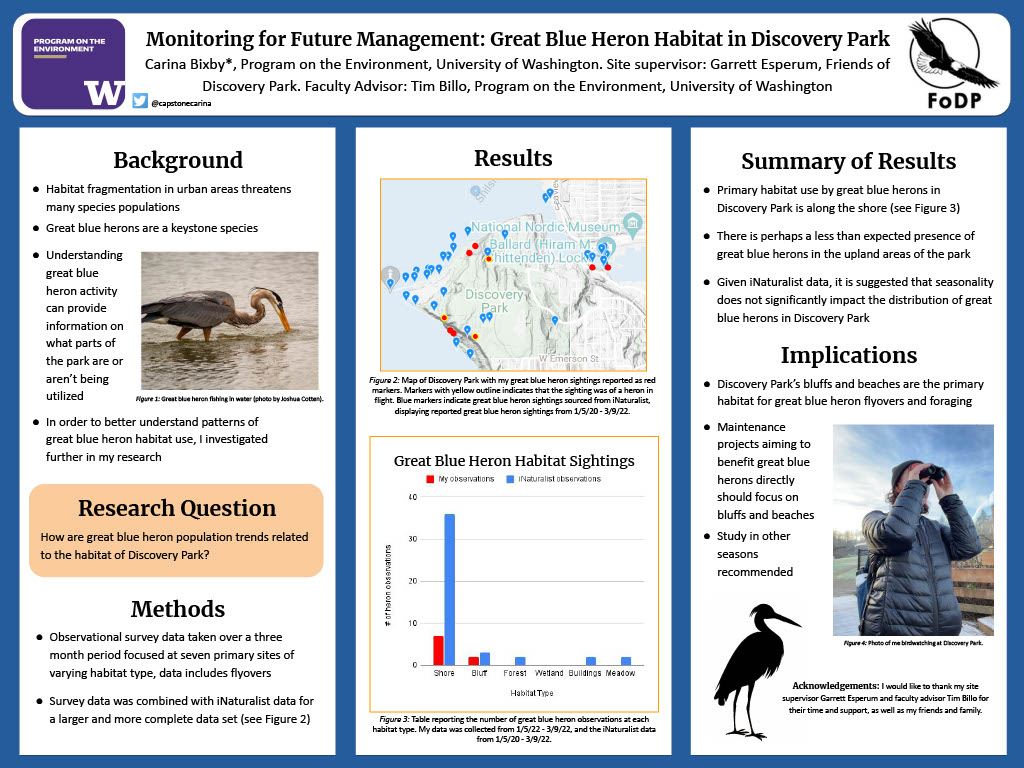 As urban areas continue to expand within the Puget Sound region, pressures on the natural environment become more visible on all ecological levels. In monitoring keystone species such as great blue herons, it is possible to evaluate how organizations such as Friends of Discovery Park (FODP) can manage natural areas to better promote habitat health and population stability. The purpose of this study was to monitor how great blue herons utilize the diverse habitat of Discovery Park, and to evaluate what abiotic and/or biotic trends influence behavior and population dispersal. This was accomplished by collecting observational data of great blue herons revolving around seven main locations across the park. Throughout the course of this internship it was found that a majority of great blue heron sightings were concentrated around the beaches of Discovery Park, with very little population data collected in the upland area of the park. Due to the foraging habits of great blue herons, the lack of presence in the upland area of the park was not an insignificant find. However, future population monitoring or perhaps utilization of citizen science databases is recommended in order to more fully map the use of Discovery Park by great blue herons. In understanding how natural spaces are utilized by keystone species, groups such as FODP are better equipped to meaningfully increase habitat health and availability in the Puget Sound through restoration and management.