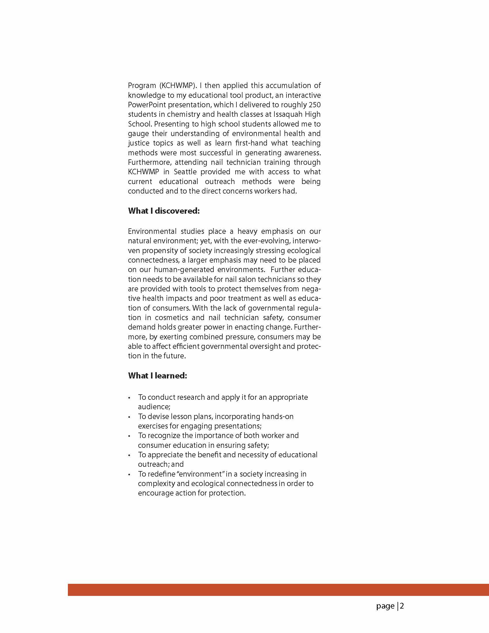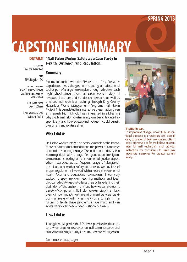 For my internship with the EPA as part of my Capstone experience, I was charged with creating an educational tool as part of a larger lesson plan through which to teach high school students on nail salon worker safety. I reviewed literature and conducted research, as well as attended nail technician training through King County Hazardous Waste Management Program’s Nail Salon Project. This cumulated in a interactive presentation given at Issaquah High School. I was interested in addressing why study nail salon worker safety was being targeted so specifically, and how educational outreach could benefit consumers and workers alike.