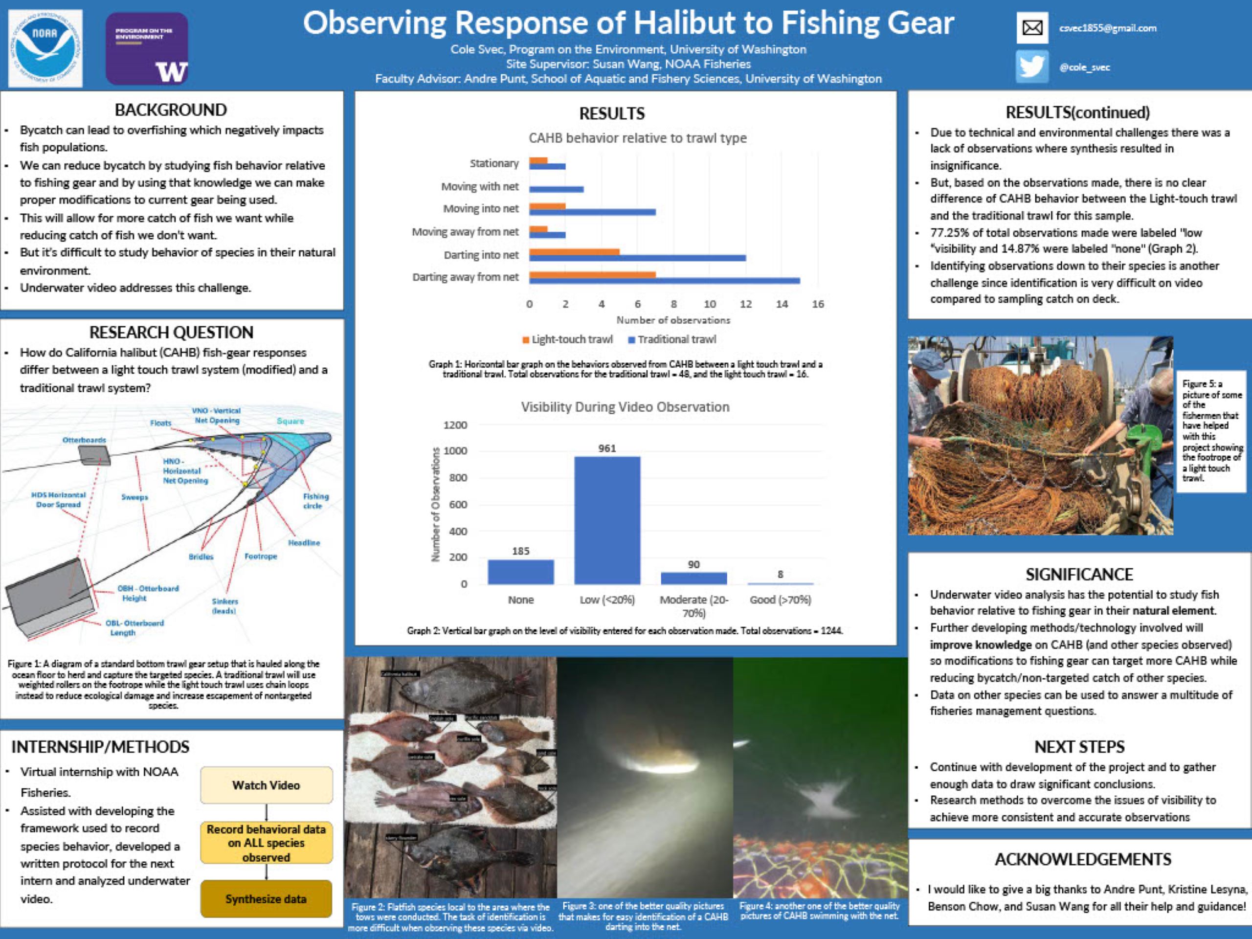 Underwater video observation has much potential to study and manage marine species populations, but is a relatively new strategy that does need to improve in certain aspects. The purpose of my internship is to develop a video analysis approach to evaluate how marine species behave relative to the fishing gear (bottom trawl) being used in the California Halibut (CAHB) bottom trawl fishery. Collaborating with commercial fishermen, cameras were attached to their fishing nets while I was assigned to analyze the hours of footage that the cameras produced. My main responsibility involved inputting data on observations of marine species from the video and helping develop the framework for how to specifically record those behavioral observations in a data spreadsheet. The results demonstrate how an underwater video-based approach is no novice task. There are many variables you must take into consideration to acquire accurate and consistent data, so it’s expected to face many challenges when starting to develop this type of program and to further carry it out. The outcome of these results holds importance because it shows that obtaining significant data is possible, but takes more time and data collection than the length of my internship (10 weeks). This plethora of information on marine species can also help solve other fishery management questions other than the one I focused on.