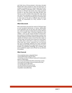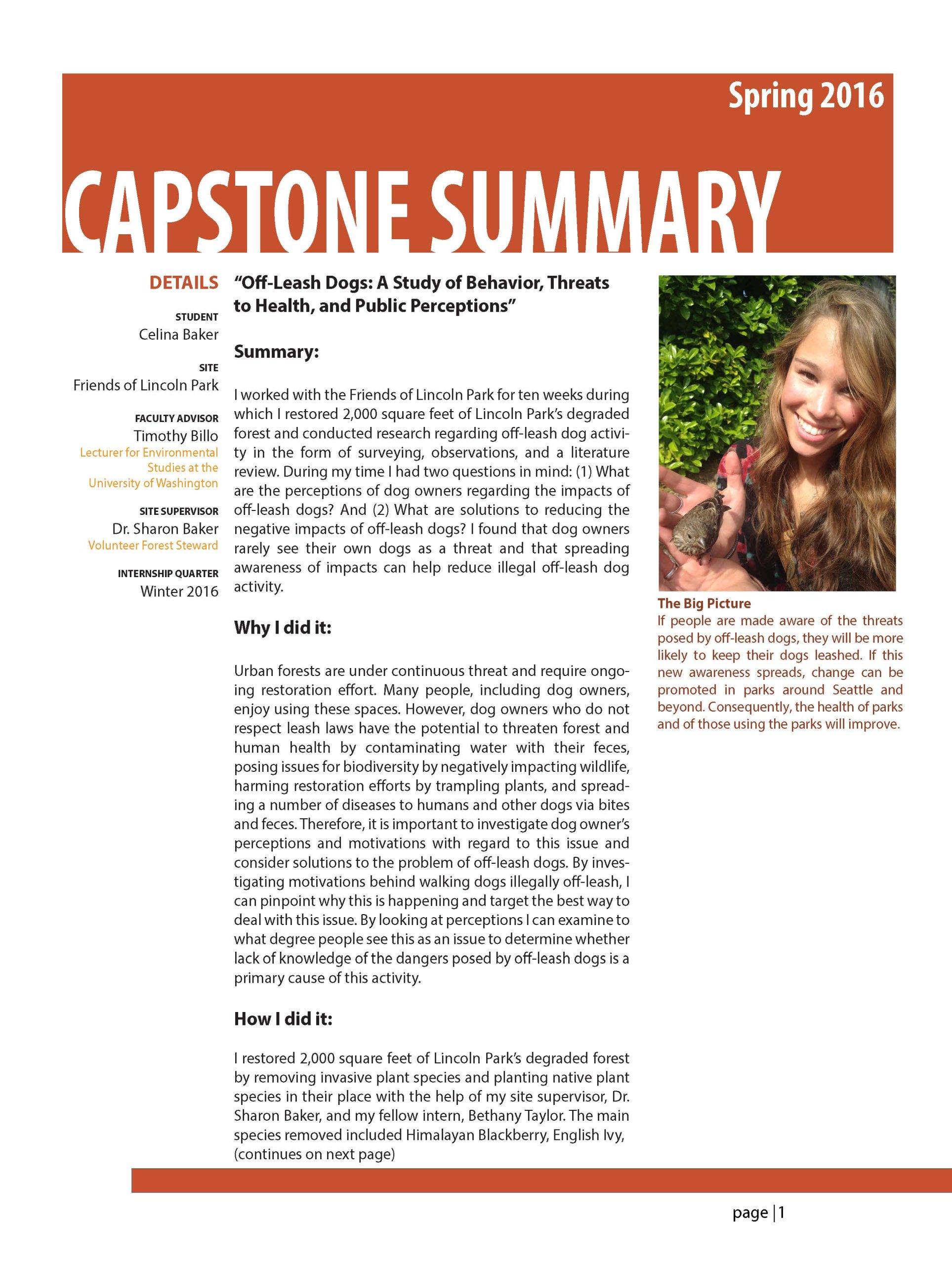 I worked with the Friends of Lincoln Park for ten weeks during which I restored 2,000 square feet of Lincoln Park’s degraded forest and conducted research regarding off-leash dog activity in the form of surveying, observations, and a literature review. During my time I had two questions in mind: (1) What are the perceptions of dog owners regarding the impacts of off-leash dogs? And (2) What are solutions to reducing the negative impacts of off-leash dogs? I found that dog owners rarely see their own dogs as a threat and that spreading awareness of impacts can help reduce illegal off-leash dog activity.