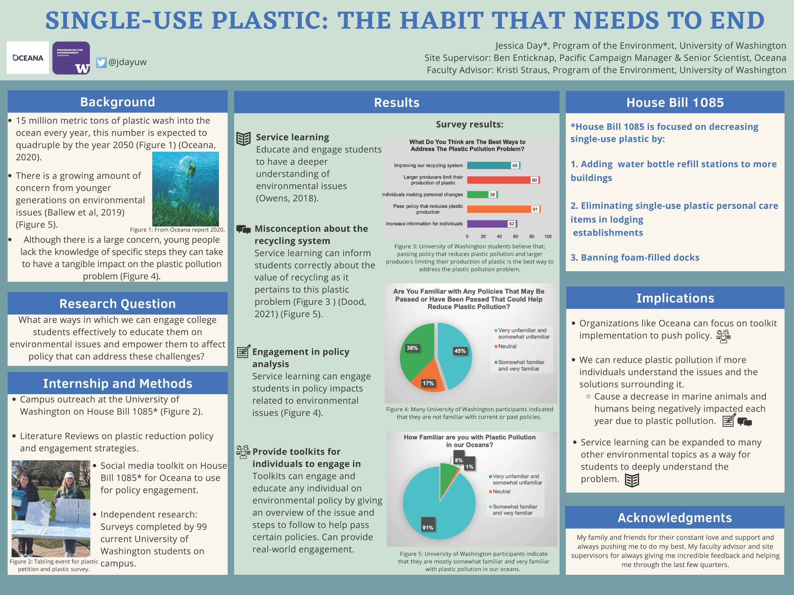 Plastic pollution has increased over the years, leading to more plastic waste runoff into our oceans, harming marine environments. The younger generation has shown a large level of concern for environmental problems, despite having a large concern, many young people do not know specific steps to make an impact on the pollution problem. This study aimed to understand the perspectives that the University of Washington students have on plastic pollution and conclude ways in which we can engage and educate college students on environmental issues. To answer, I focused on advocating for two plastic reduction bills in Washington while interning with Oceana. My main research was accomplished by creating a survey for students about plastic pollution, distributing a petition in favor of the bills, and designing a toolkit to amplify the policies. After concluding my research, I discovered that service learning was an important way to educate and engage students on the environmental issue of plastic pollution. Engagement in policy analysis and providing a toolkit for individuals to engage in can also be added for extra engagement and education. These results are significant because we can reduce overall plastic pollution if more individuals understand the issues and the solutions surrounding it. Service learning can also be used to engage and educate students on any topic in the environmental world. If plastic pollution is reduced by passing policy, we can help heal the ocean’s biodiversity, decrease the number of marine animals injured, and save humans from plastic contamination.
