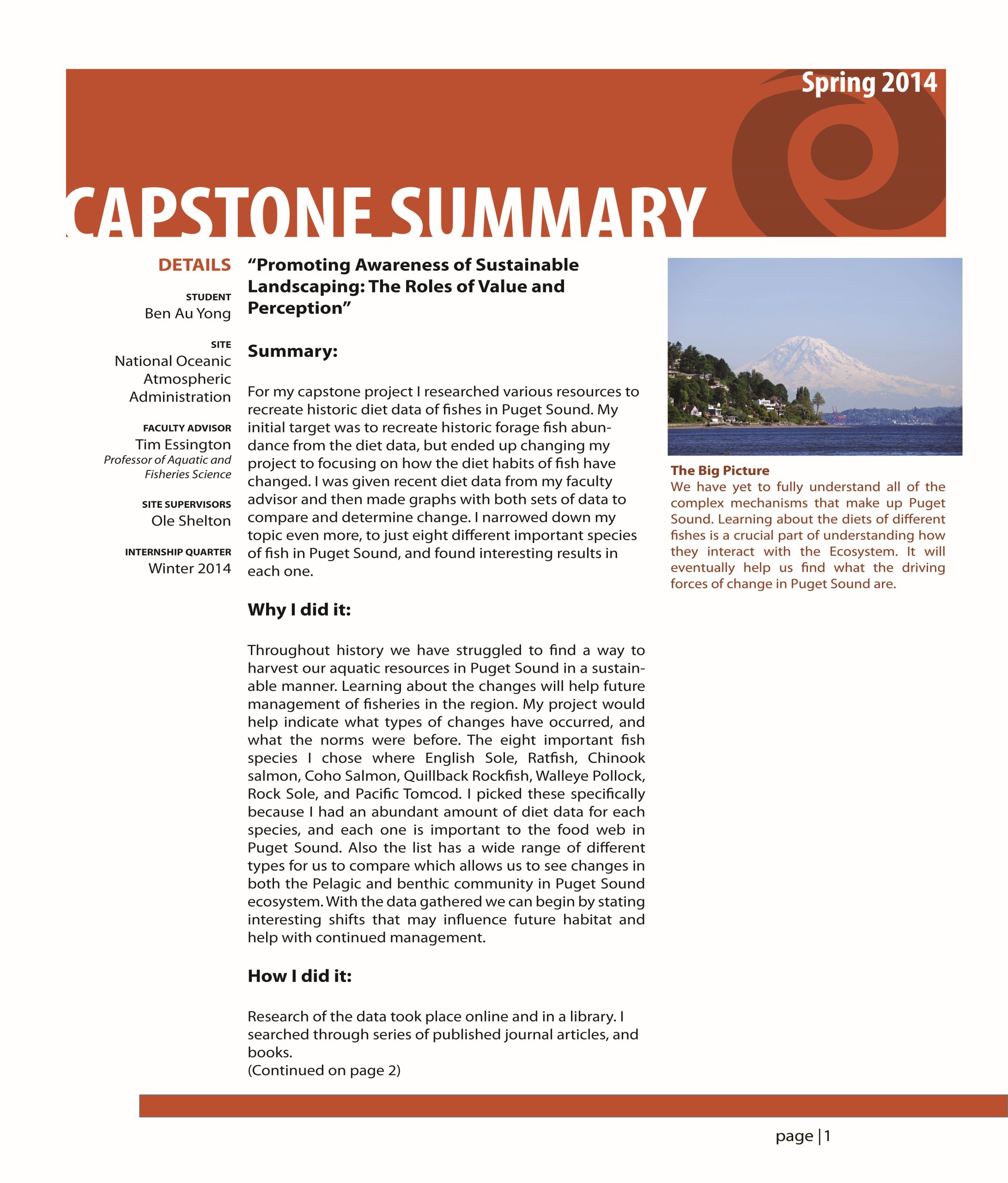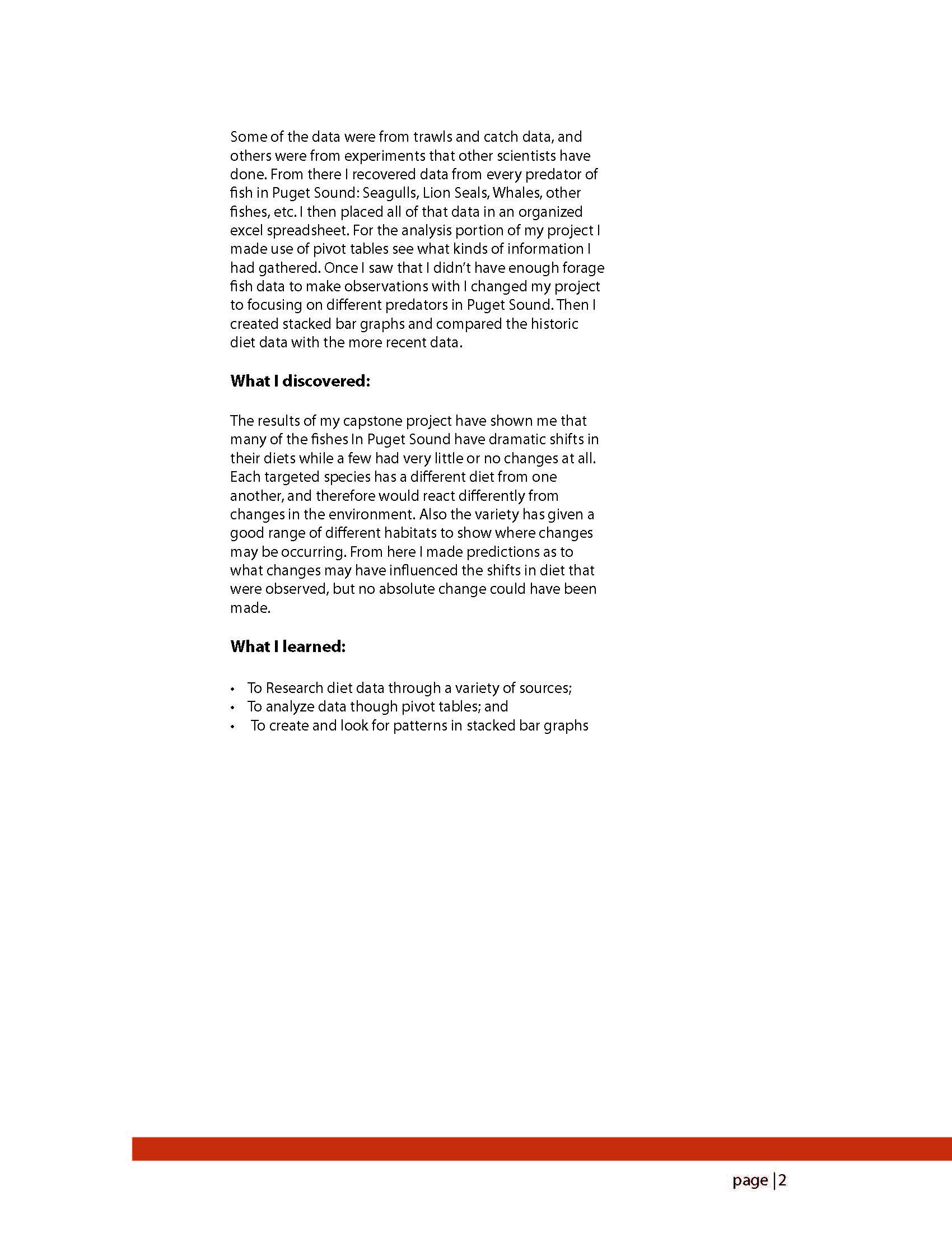 For my capstone project I researched various resources to recreate historic diet data of fishes in Puget Sound. My initial target was to recreate historic forage fish abun- dance from the diet data, but ended up changing my project to focusing on how the diet habits of fish have changed. I was given recent diet data from my faculty advisor and then made graphs with both sets of data to compare and determine change. I narrowed down my topic even more, to just eight different important species of fish in Puget Sound, and found interesting results in each one.