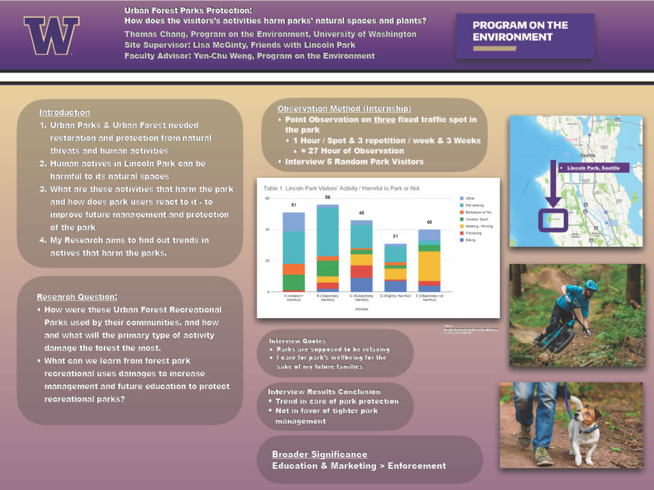 Forest Park is an important part of urban greeneries, it plays an important role in balancing a city’s ecosystem and environment. However, these parks face threats from nature and from a human. From nature, the park faces threats from invasive species. And, from humans, the park faces threats from park users’ activities. These activities can hurt and damage the park in different ways and to different extremes may it be permanent. These activities that have the potential of hurting and damaging the forest observed during the length of the capstone include, but are not limited to, jogging (running), walking, picnicking, skateboarding, biking, smoking, and pet-walking. Observation shows that a great portion of the observed activity can be listed and categorized as “potentially hurtful” to the park’s ecosystem. These activities observations show how park users are utilizing the park and can provide the park management team with solid data in improving their protection and protocols in protecting and restoring the forest in the park.