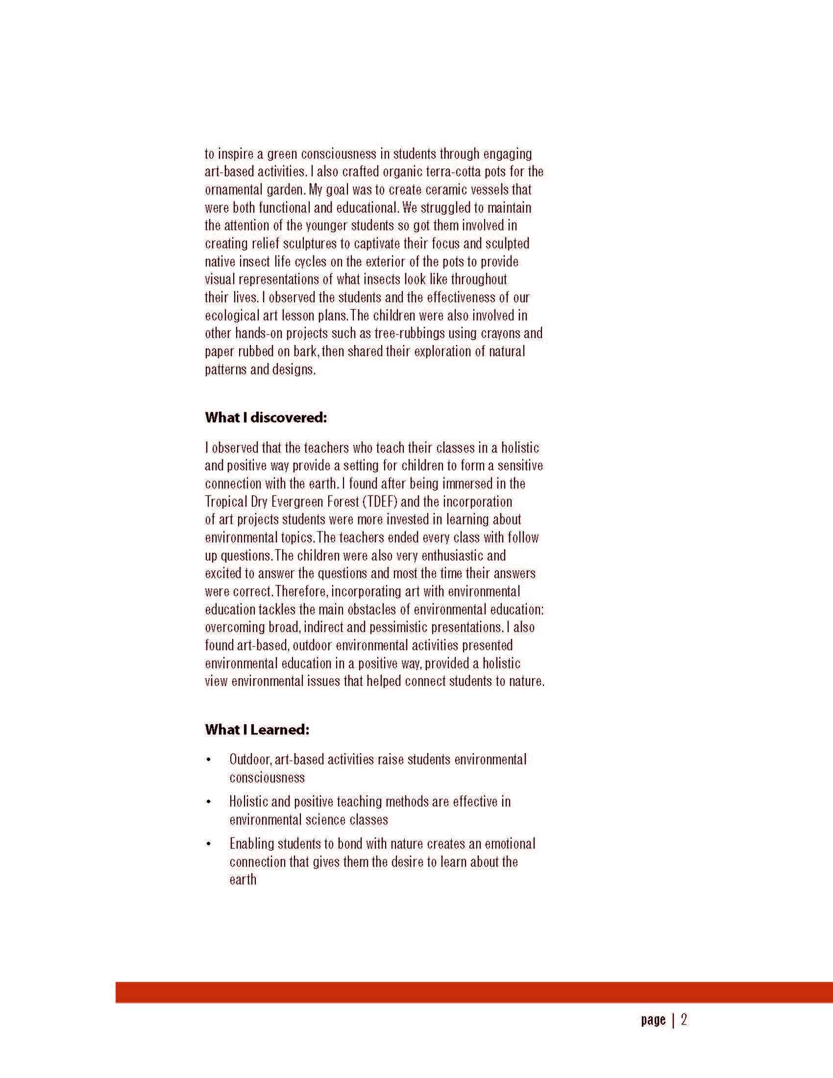 Auroville is a community in Southern India in the State of Tamil Nadu focused on human unity and harmony. My internship was the Botanical Gardens in Auroville. I helped teach environmental classes and make functional and educational organic terra cotta pots for the Ornamental Garden. My capstone project used ecological art as a teaching tool to enhance the emotional attachment between children and the earth. The aim of my research and capstone project was to explore interdisciplinary teaching tools that strengthen environmental curriculums, in kindergarten through eighth grade.