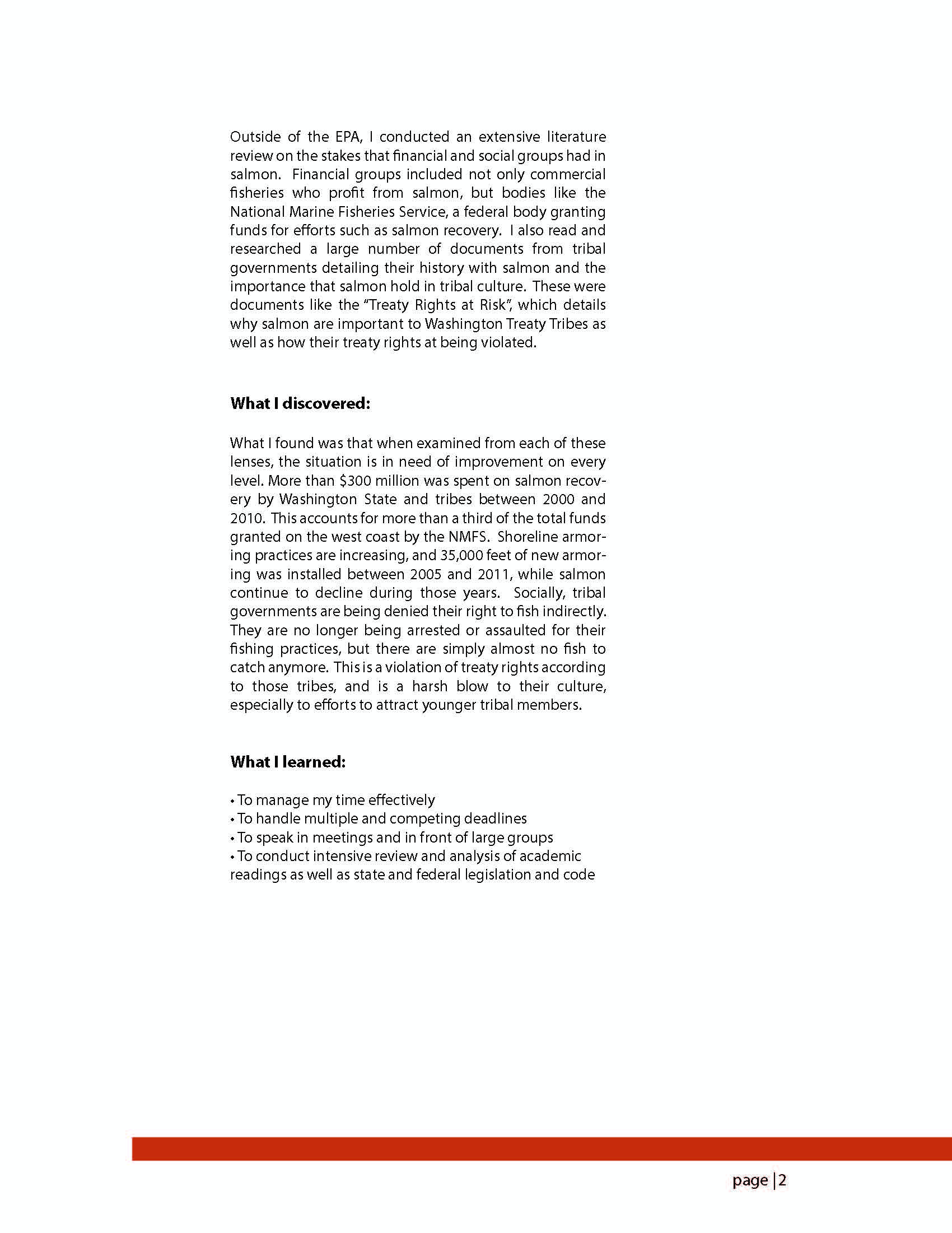 I researched holes in permitting processes required for shoreline armoring projects in Puget Sound. This subject was chosen because the Tulalip tribe raised the issue of salmon decline to the EPA Region 10 office on behalf of many treaty tribes in Puget Sound, and shoreline armoring has been deemed by the Environmental Protection Agency (EPA) as a major problem issue I wanted to look at the issue on a wider scale, so I opted to analyze the issue through a triple bottom line approach, which can serve as a compre- hensive look at the issue that can help us move towards a more effective solution.
