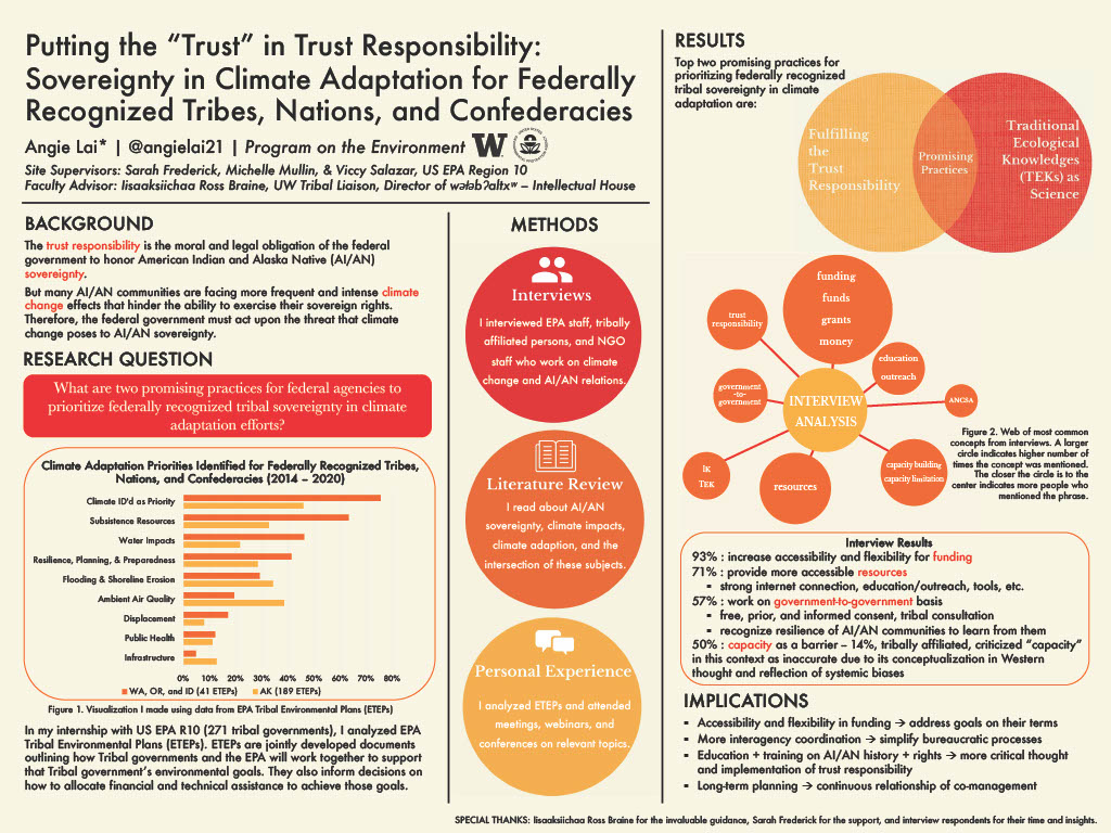 Many American Indian and Alaska Native (AI/AN) communities in this region are experiencing negative impacts of climate change, like extreme weather events, that result in displacement and threats to infrastructure and public health. This affects the ability of AI/AN communities to exercise their sovereignty, and the federal government has a moral and legal responsibility to address threats to AI/AN sovereign rights. The aim of this study was to determine what promising practices federal agencies can take to prioritize federally recognized Tribal sovereignty in climate adaptation. My internship with EPA Region 10 involved analyzing and visualizing data for EPA Tribal Environmental Plans (ETEPs). ETEPs are co-created documents that describe Tribal governments’ environmental concerns to inform EPA’s decisions on how to allocate financial and technical assistance to address those concerns. I also conducted interviews with EPA staff, tribally affiliated persons, and NGO staff who work on climate change and AI/AN relations on their perspectives regarding federally recognized Tribal sovereignty in the context of their work. Lastly, I reviewed scholarly literature on AI/AN sovereignty, climate impacts, climate adaption, collaboration, and the intersection of these subjects. Promising practices to prioritize federally recognized Tribal sovereignty include upholding the trust responsibility through respectful consultation and adequate technical and financial assistance. Additionally, federal agencies should recognize and value Traditional Ecological Knowledges as science while applying them respectfully and legally. Following these promising practices would help affirm AI/AN sovereignty and give the federal government the opportunity to demonstrate its commitment to environmental justice.