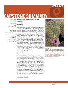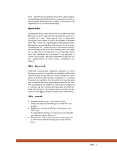I worked with the Skokomish Tribal Nation to make a film documenting their traditional plant foraging. I filmed interviews and local plant gathering with a few tribal members. I was interested in learning the cultural signifi- cance of connectedness to food for the Skokomish and how the preservation of food traditions help to preserve cultural traditions. The focus was to film the gathering of specific plants, when and how they were gathered, and their uses. Interviewees detailed the importance of passing on their knowledge of the plants: preserving their culture, aiding in community health, and promoting sustainability. Participants also discussed the potential environmental threats to maintaining these traditions and how property rights play a role. I was able to learn about restoration work being done in the Skokomish area film discussion on the topic. The goal was to produce a short documentary that can be used to educate Skokomish youth on native plant gathering.