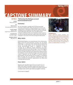 For my internship, I worked with the Environmental Priorities Coalition (EPC.) We campaigned to close a tax loophole for oil refineries in Washington state in order to hold Big Oil accountable for climate impacts and provide more funding for education. This included various outreach activities online, over the phone, and in-person, as well as interviewing active citizens about why they are invested in the issues of climate change and education.