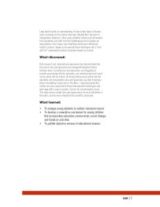 Over the summer of 2011, I assisted in teaching conservation education at the Seattle Aquarium. I taught the overarching topics of overfishing, ecosystems services and sustainable living practices to students and visitors. I became interested in understanding how the Seattle Aquarium infiuences the actions and behaviors of its visitors. I began observing the different teaching techniques used by the Seattle Aquarium and was able to identify were three main techniques: hands on, alternative choices and localizing issues. Then, I researched the efficiency of these techniques on, infiuencing social dynamics and was able to incorporate them into a new curriculum.